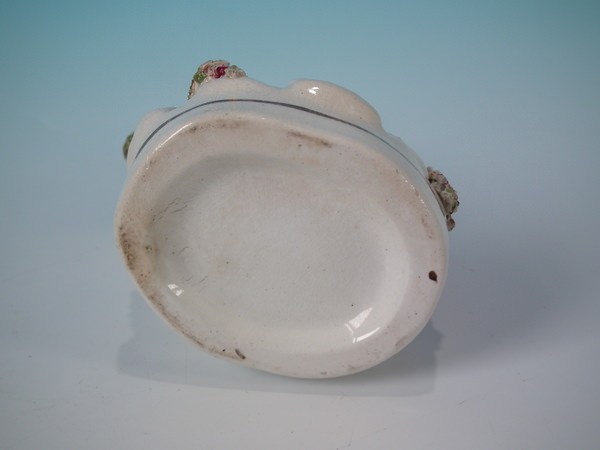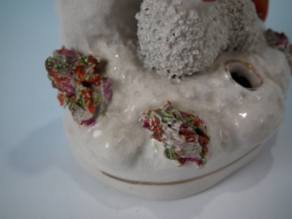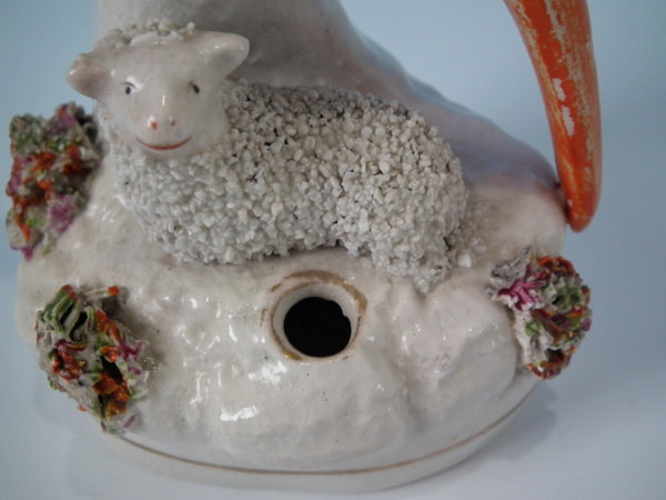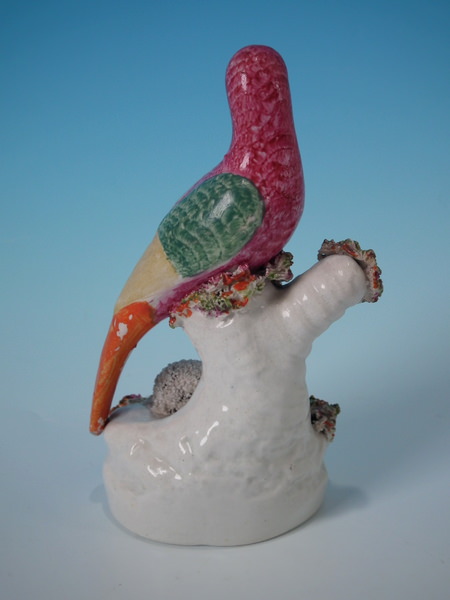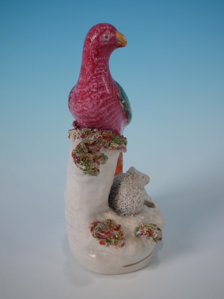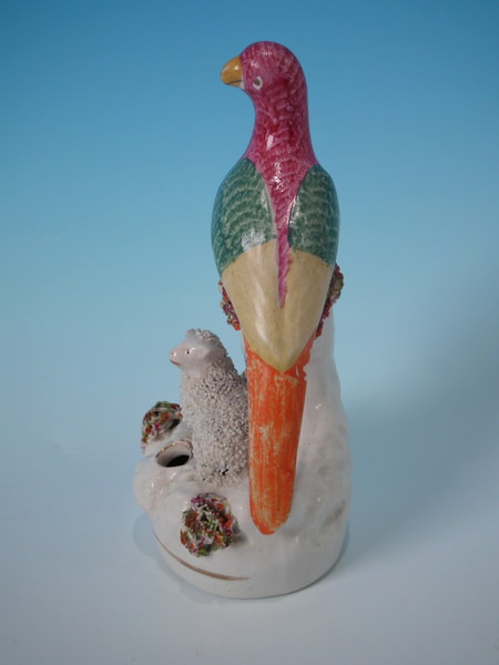Victorian, circa 1860. 5.9ins high, 2.8ins wide, 2.4ins depth. Staffordshire quill holder which features a parrot sat on a tree stump with a lamb below, recumbent on an oval base.
