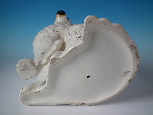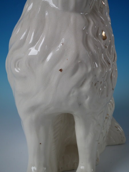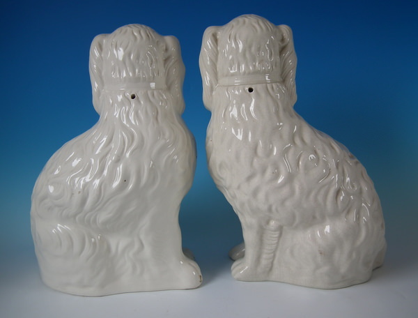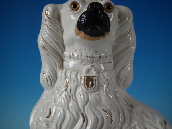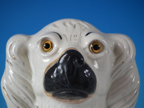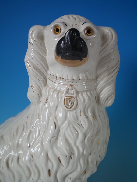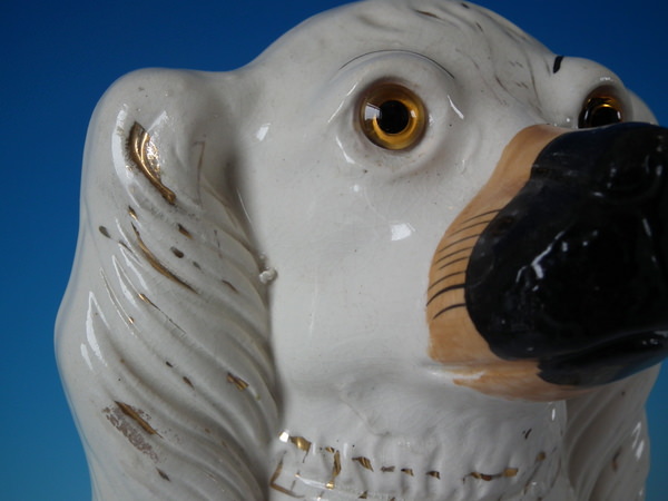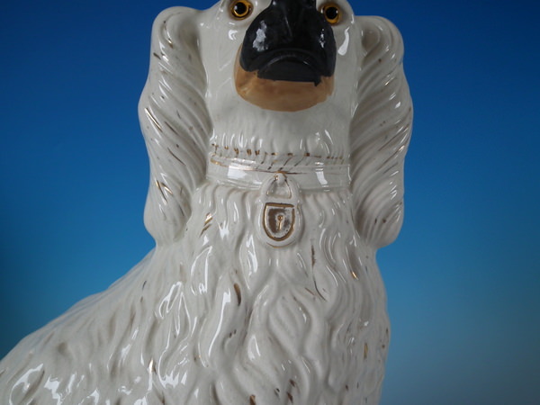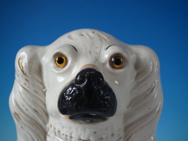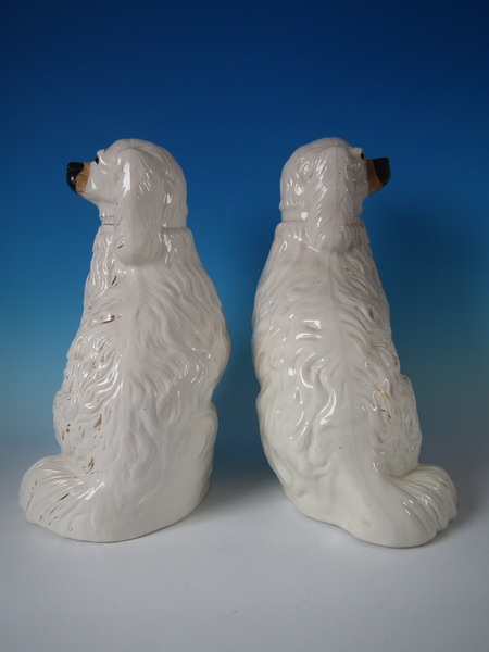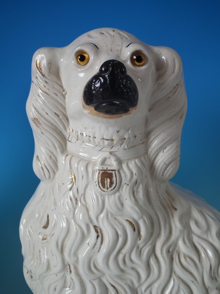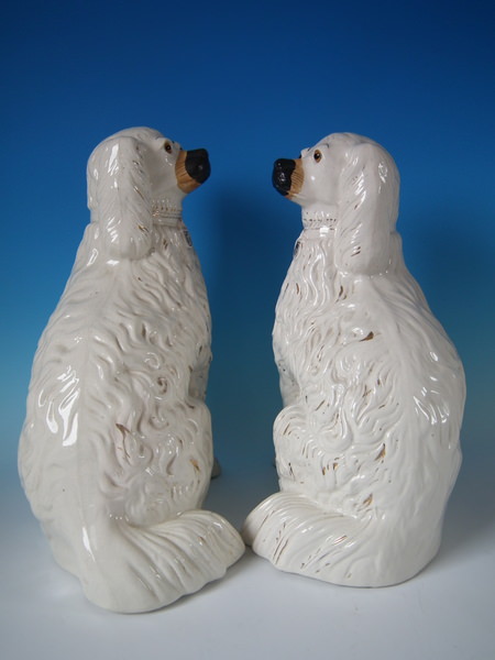 Victorian, circa 1880. Tallest is 15.9ins high, 11.8ins wide, 8.3ins depth. Pair of Staffordshire glass eyed figures which feature a very large spaniel,