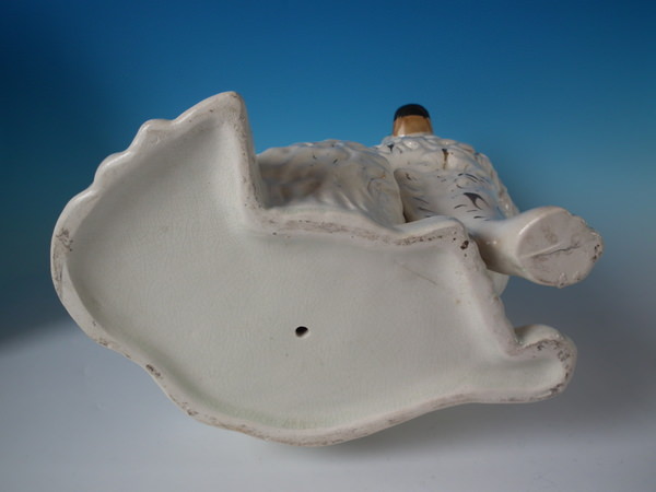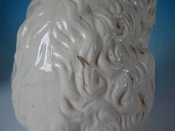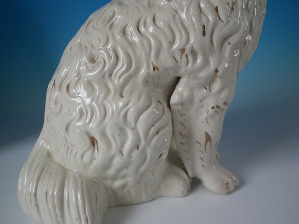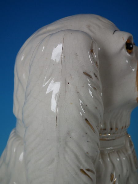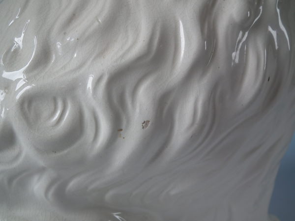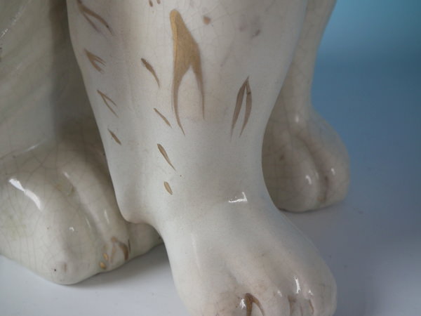 KILN EFFECTS: a few specks of kiln detritus and kiln grit caught in the glaze to dog's right side and right ear.