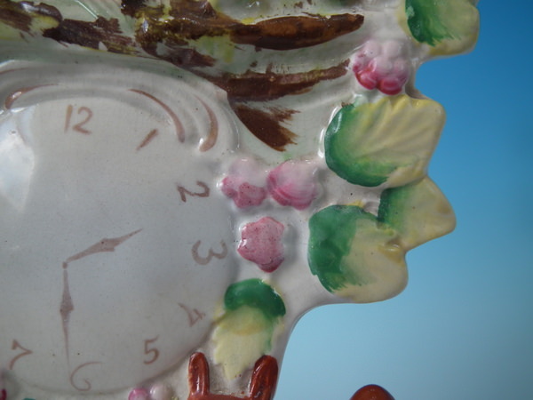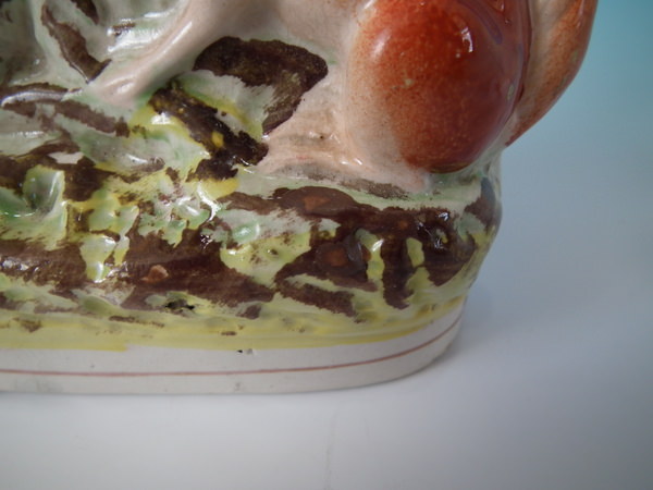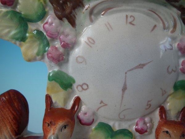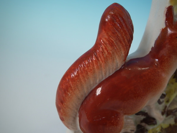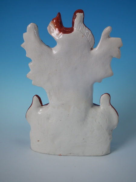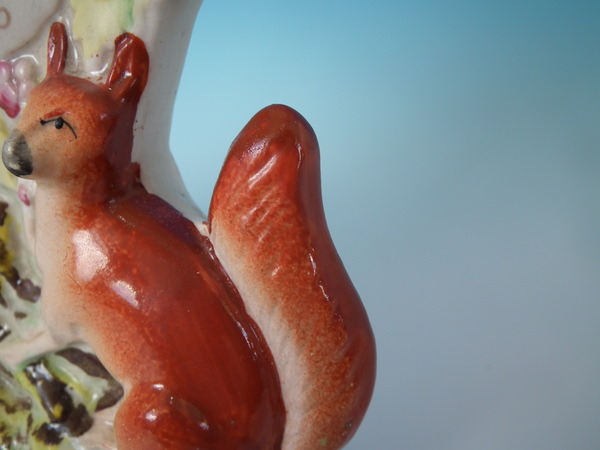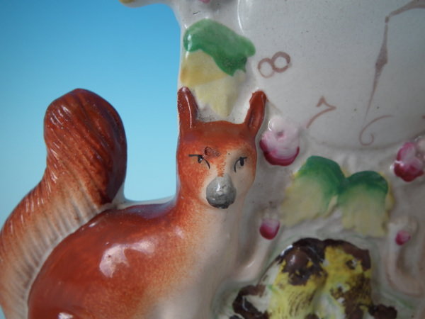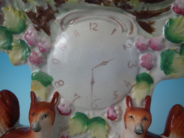 Victorian, circa 1860. 10.2ins high, 6.3ins wide, 2.2ins depth. Staffordshire clock group which features a clock with three squirrels, seated on a shaped base. Dull gilt base line and embellishment.