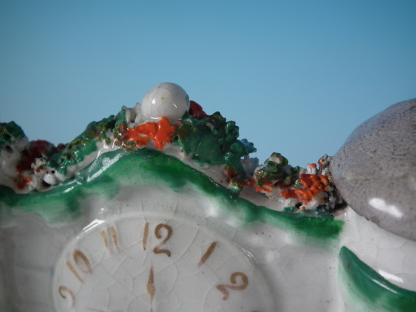 Victorian, circa 1860. 8.3ins high, 6.9ins wide, 2ins depth. Staffordshire spill vase which features a clock tower with arches underneath, stood on an oval base.