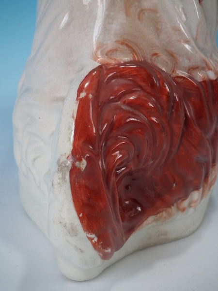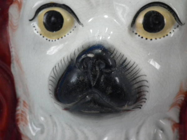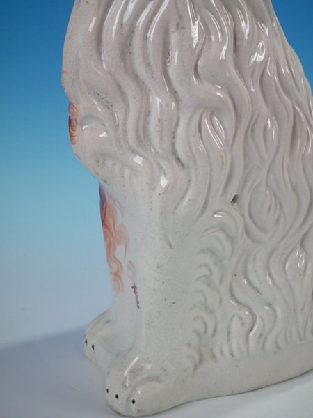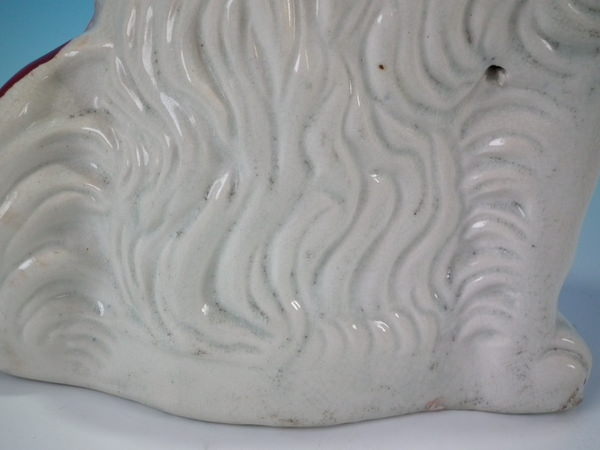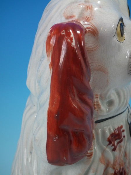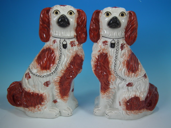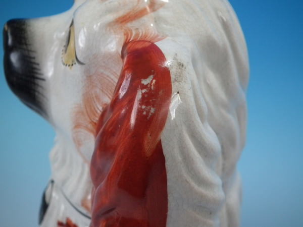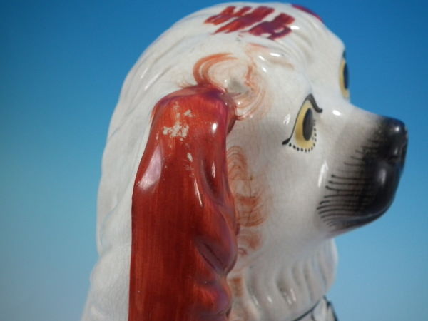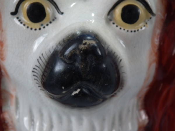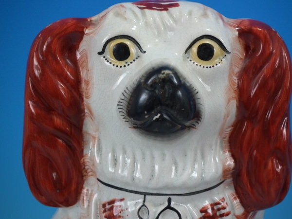 Pair of Staffordshire figures which feature a spaniel, seated directly on the ground, no base.