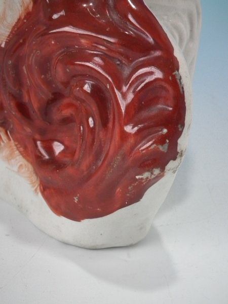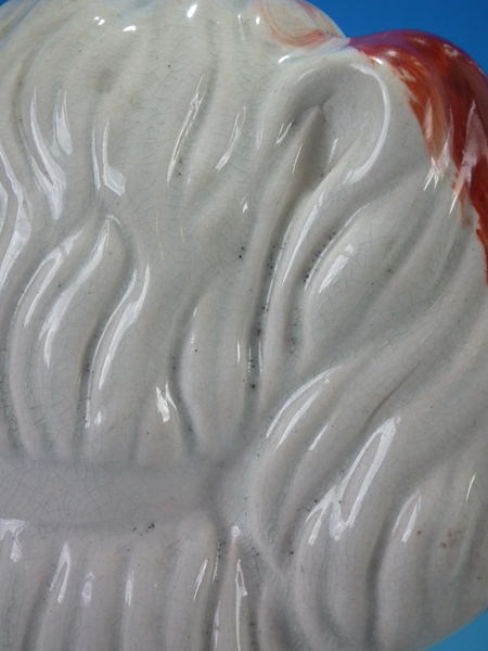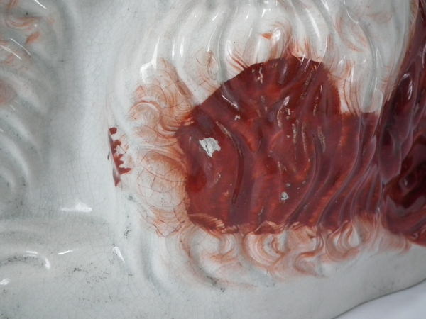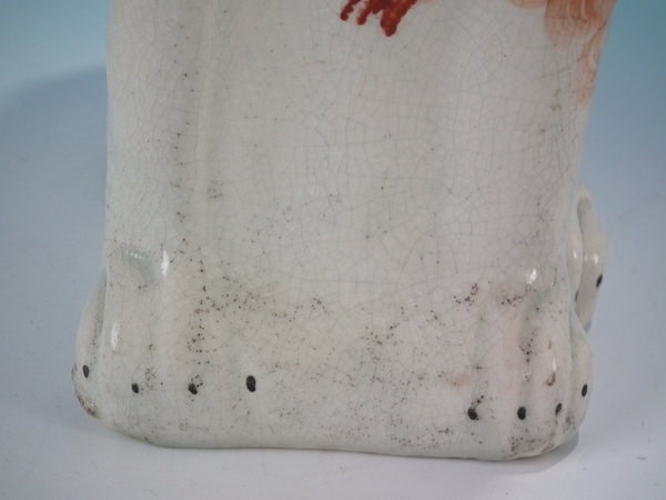 KILN EFFECTS: kiln soot caught in the glaze to the reverse and between front legs.