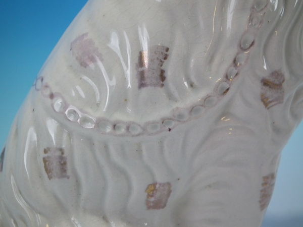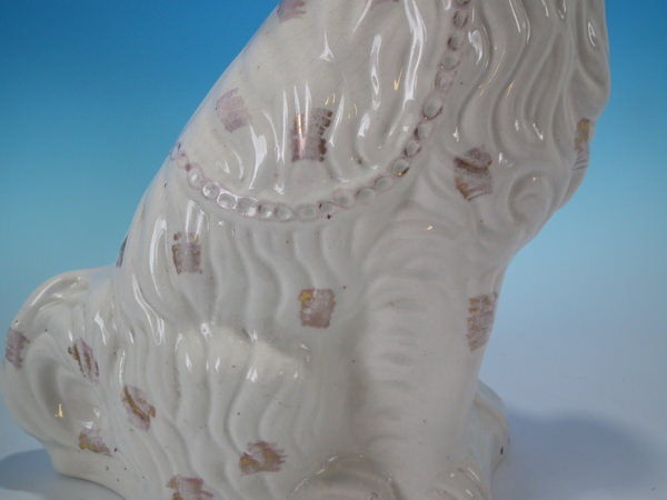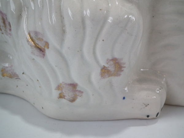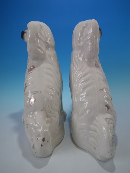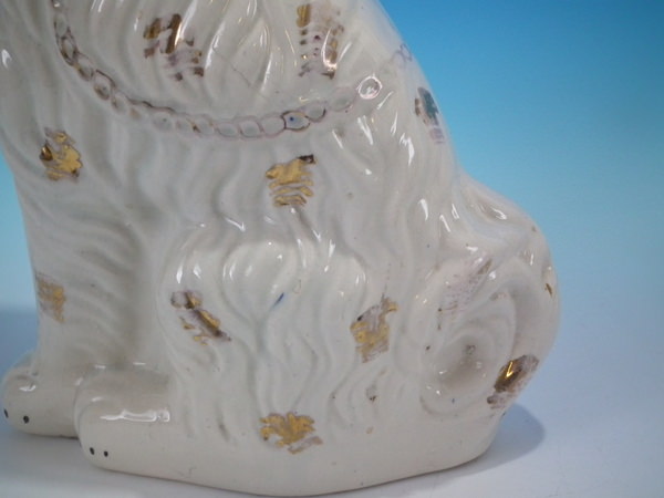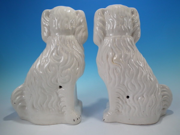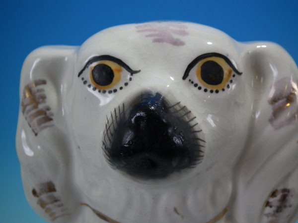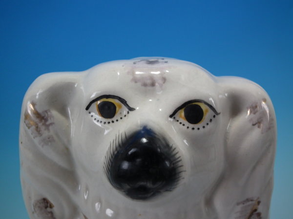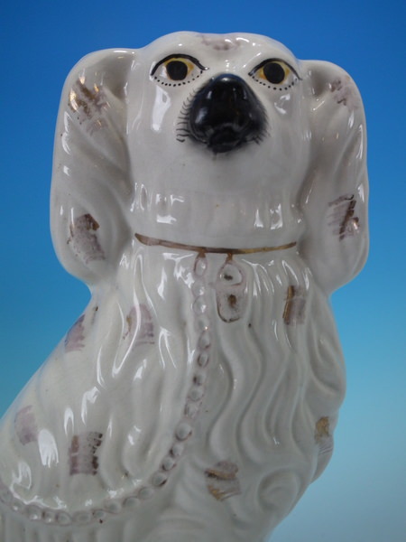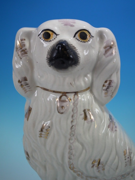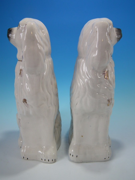 Victorian, circa 1880. Tallest is 14.8ins high, 9.8ins wide, 5.1ins depth. Pair of Staffordshire figures which feature a spaniel, seated directly on the ground, no base.