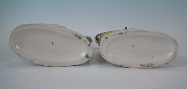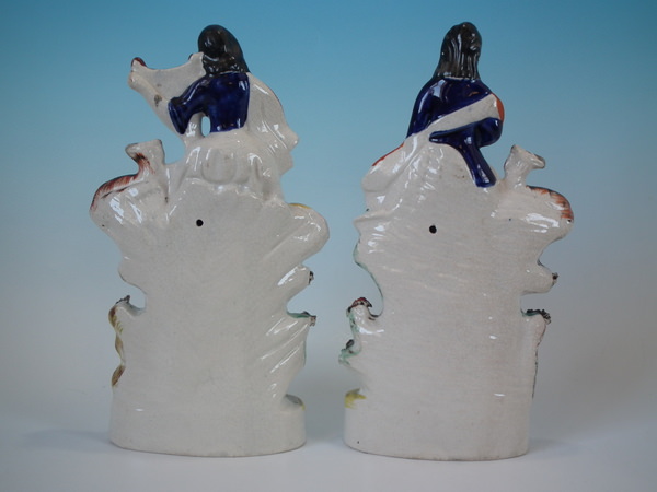Pair of Staffordshire figures with a musical theme which feature a boy and girl both with musical instruments by a stream,