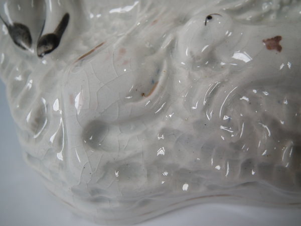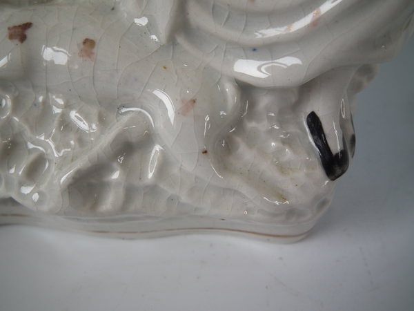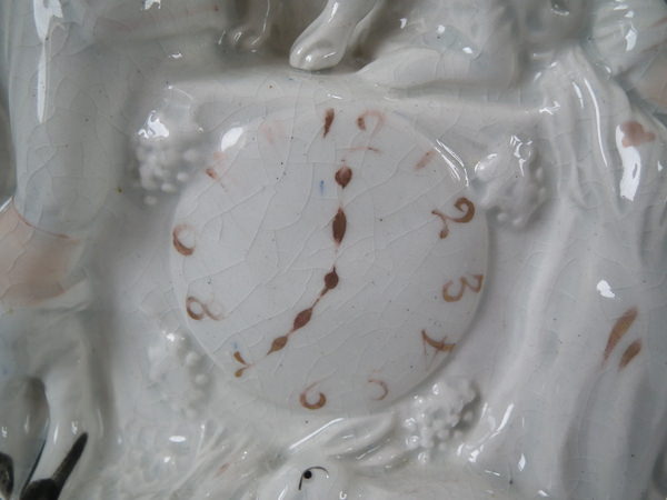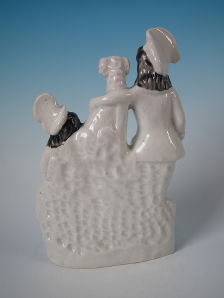 Victorian, circa 1860. 11ins high, 7.5ins wide, 3.1ins depth. Staffordshire clock group with a hunting theme which features a couple either side a clock, with a spaniel seated on top and game below, resting on a shaped base.