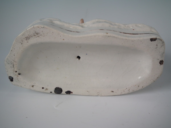 Dull gilt base line and embellishment. Flatback, decorated mainly to the front. Vent hole to the underside.