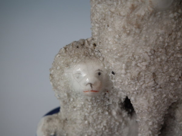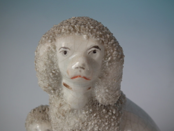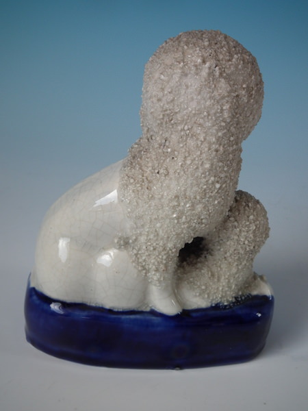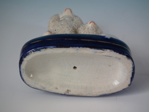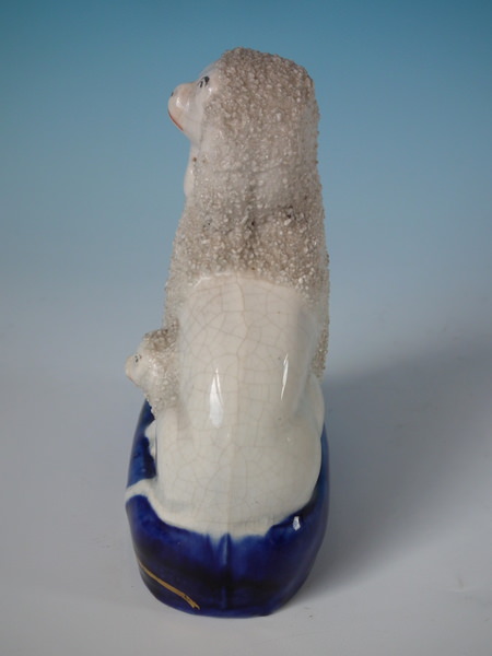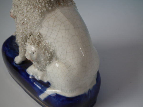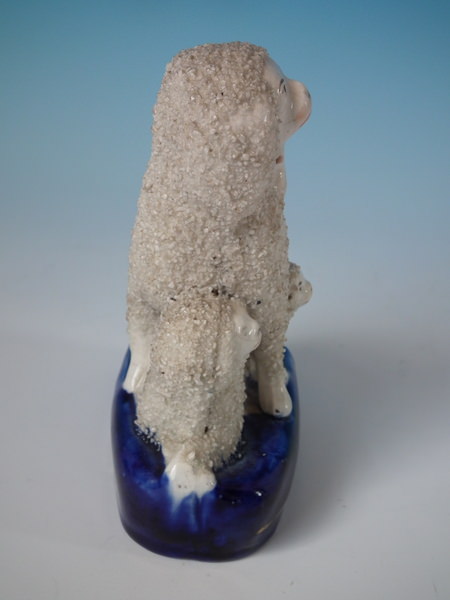 Victorian, circa 1860. 5.1ins high, 2ins wide, 4ins depth. Staffordshire group which features a poodle and her two pups, seated on a cobalt blue base.