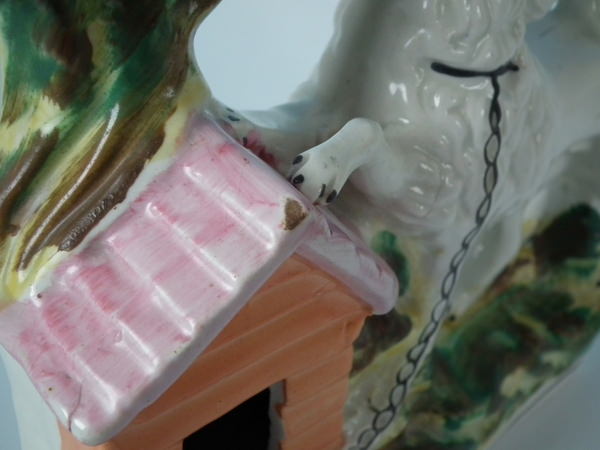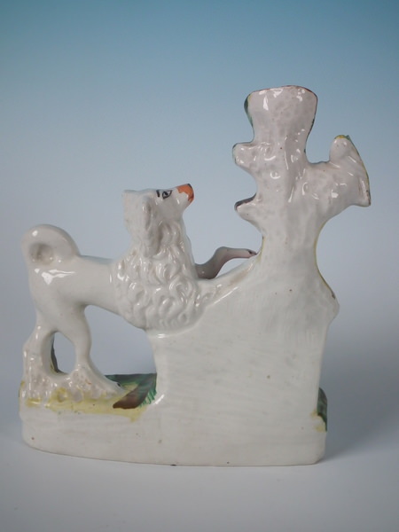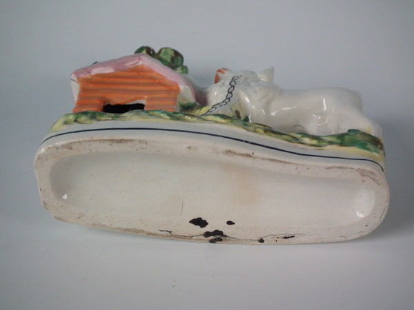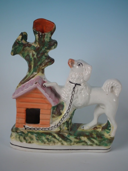 Victorian, circa 1860. 8.1ins high, 6.7ins wide, 2.4ins depth. Staffordshire spill vase which features a poodle chained to its kennel, stood on a shaped base.