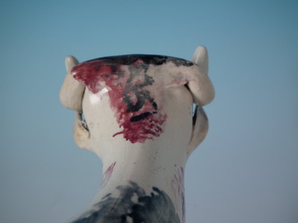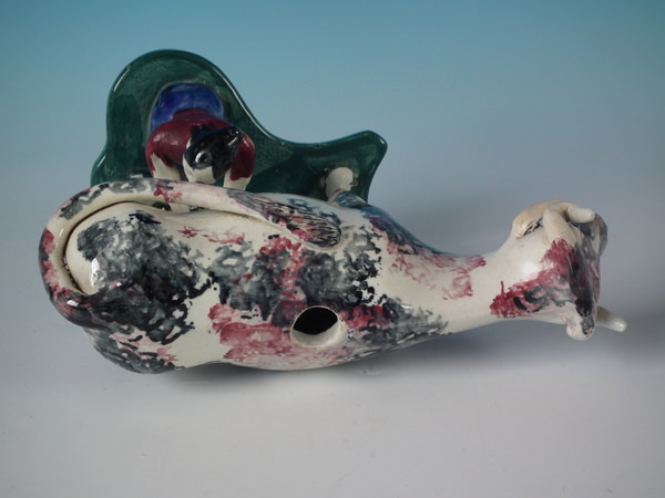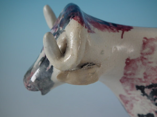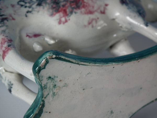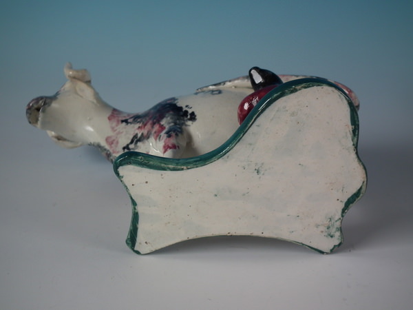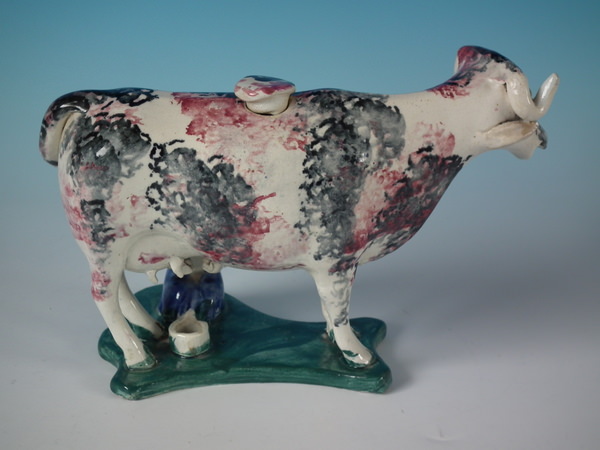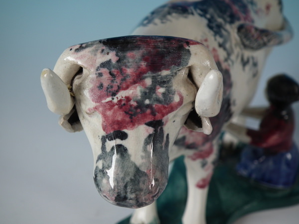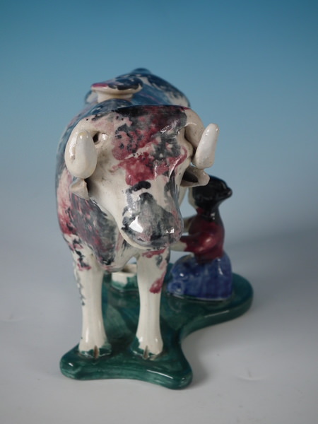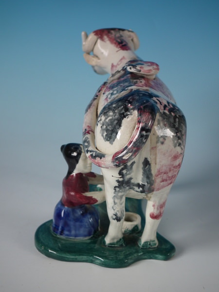 pre-Victorian, circa 1820. 5.1ins high, 6.5ins wide, 3.9ins depth. Staffordshire pearlware cow creamer with a pastoral theme which features a milkmaid milking a cow,