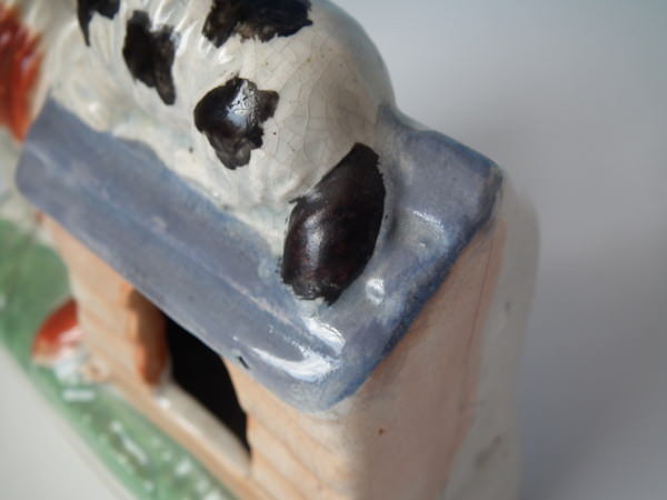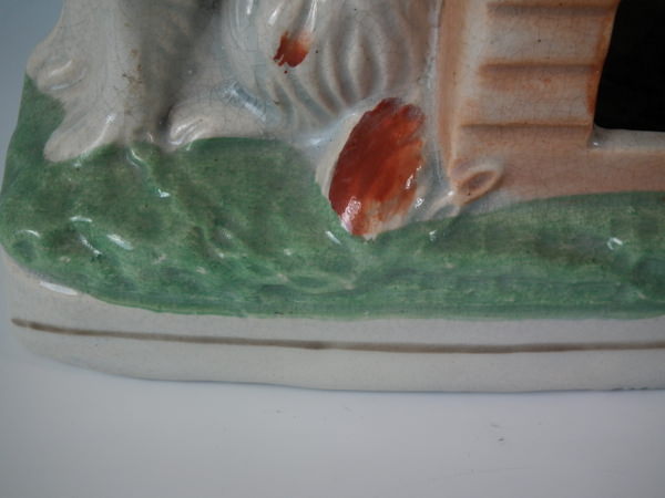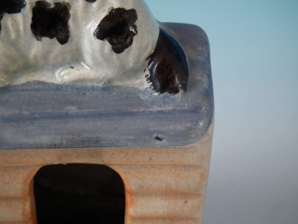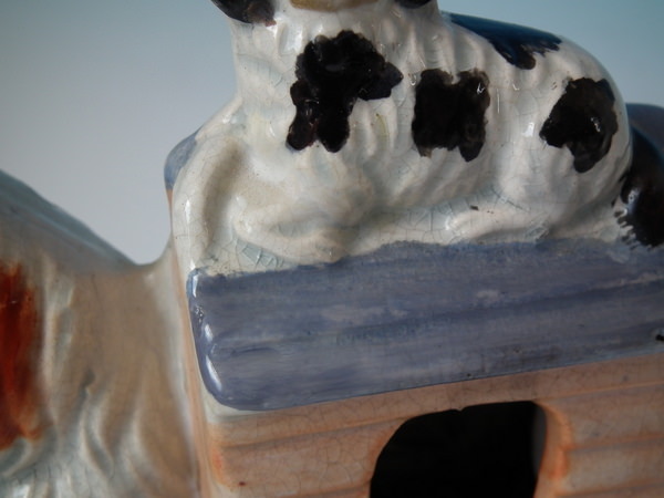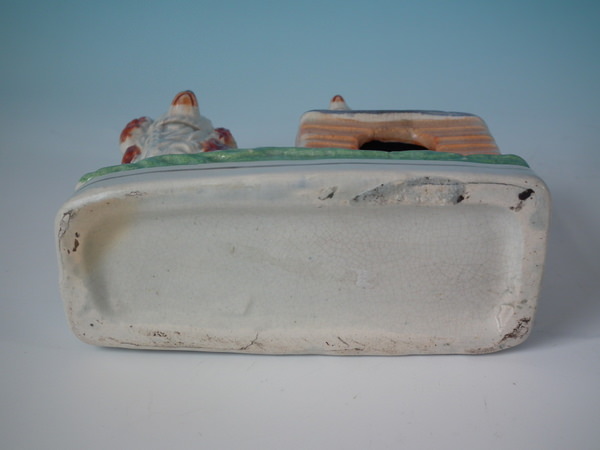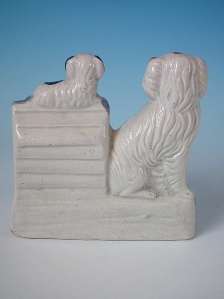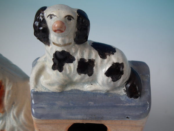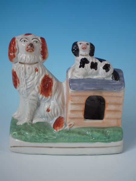 Victorian, circa 1860. 5.9ins high, 5.8ins wide, 2.5ins depth. Staffordshire group which features a spaniel with her pup next to a kennel, seated on a rectangular base.