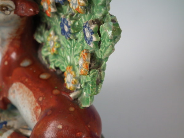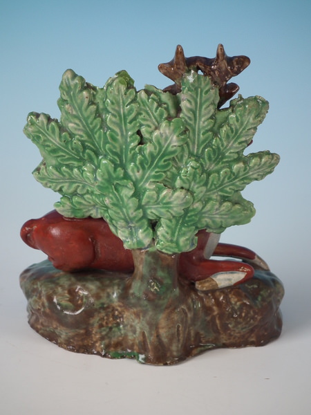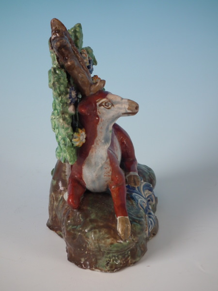 pre-Victorian, circa 1820. 4.5ins high, 3.9ins wide, 2.4ins depth. Staffordshire pearlware bocage figure which features a stag, recumbent on a shaped hollow base.