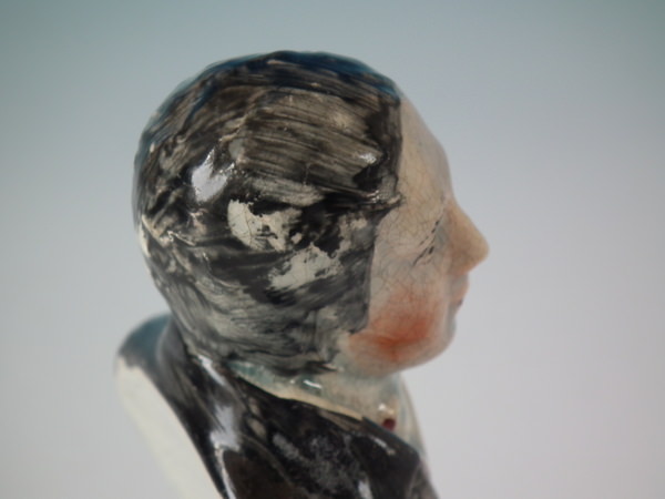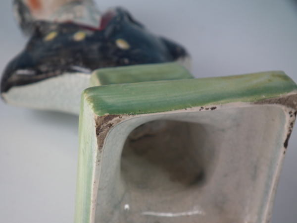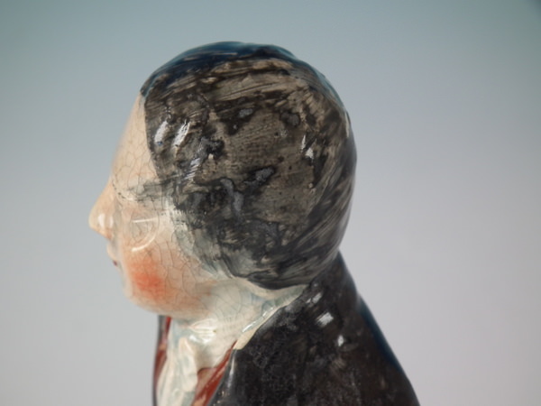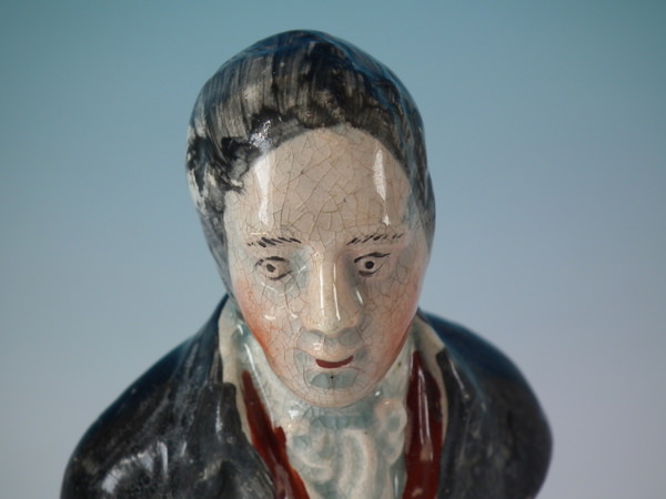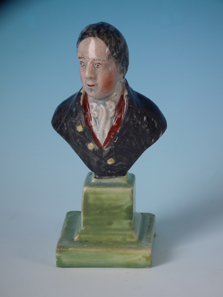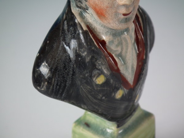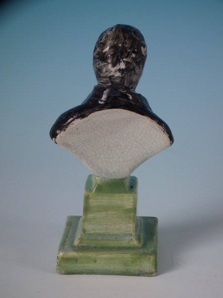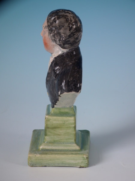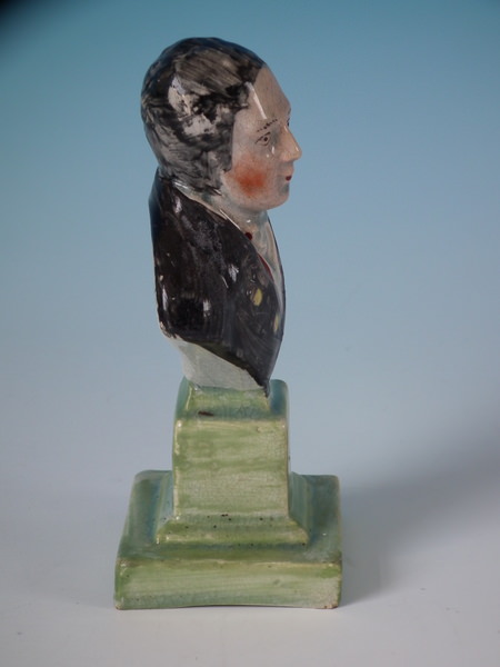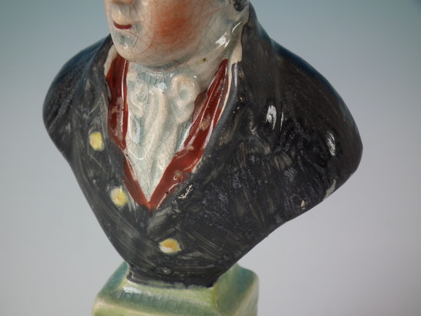 pre-Victorian, circa 1820. 5.4ins high, 2.8ins wide, 2.2ins depth. Staffordshire pearlware bust which features an unidentified gentleman, resting on a plinth base.