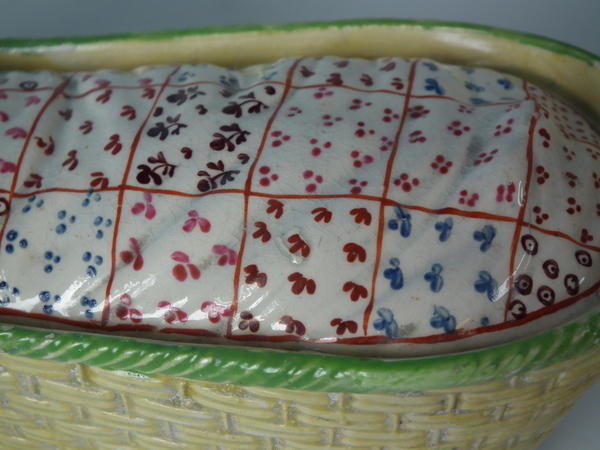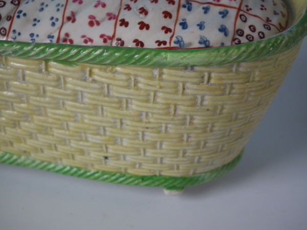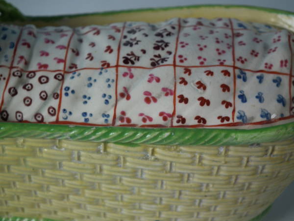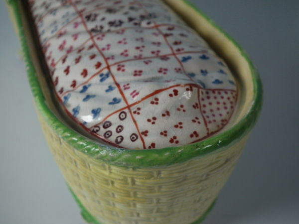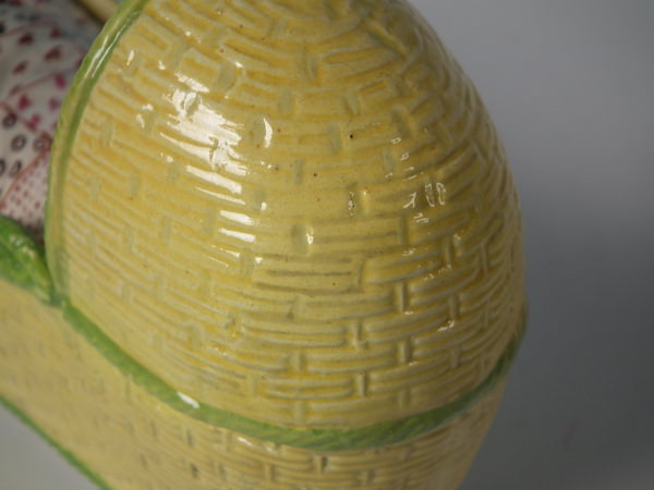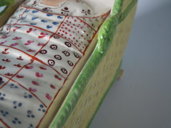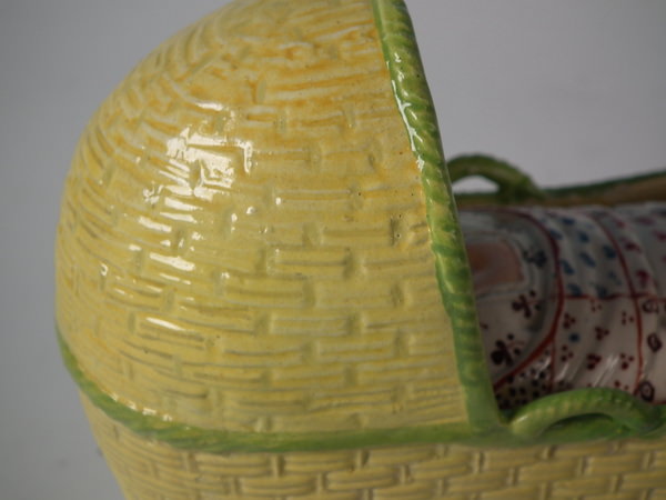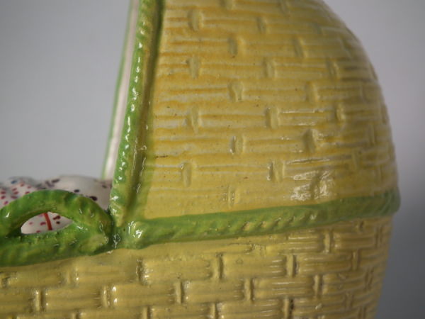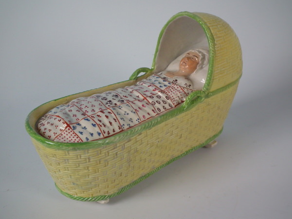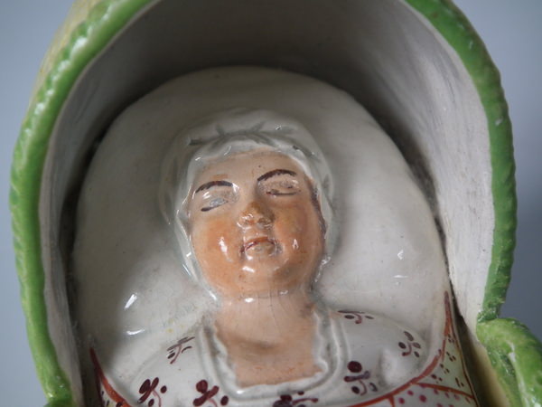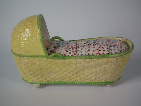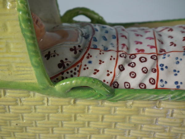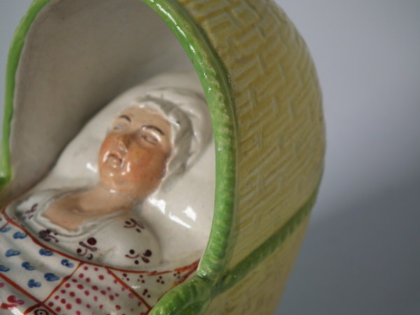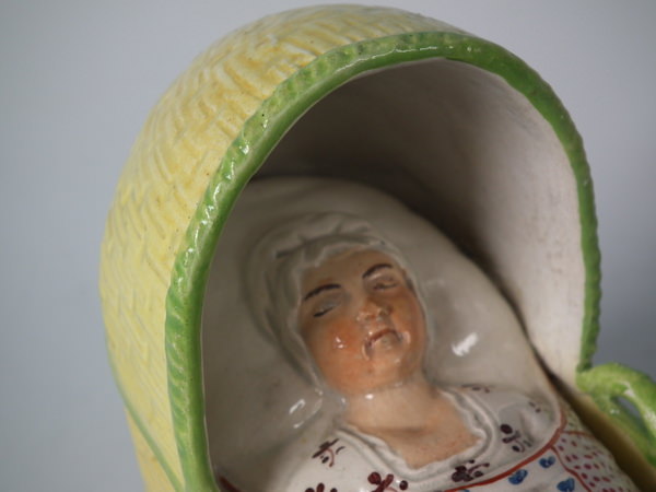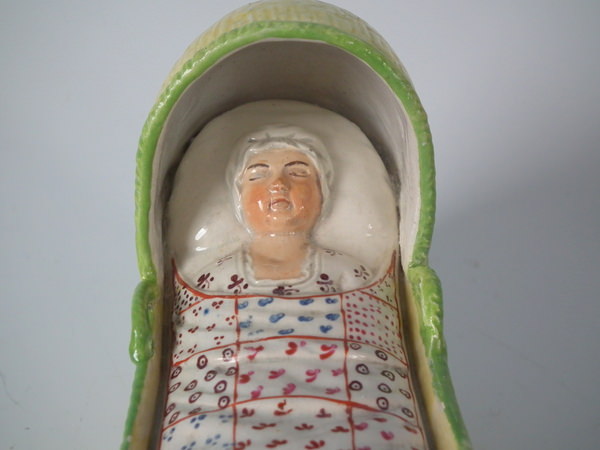 pre-Victorian, circa 1820. 4.3ins high, 7.3ins wide, 2.8ins depth. Staffordshire pearlware figure which features a child asleep in a rocking cradle,