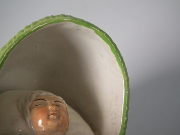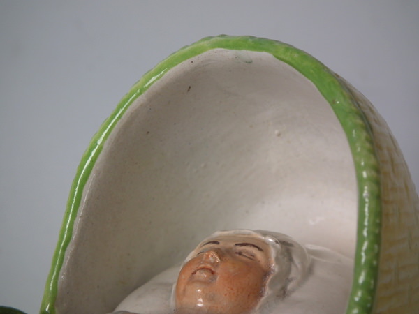 Retouched flake to baby's nose and paint losses to rim of cradle.