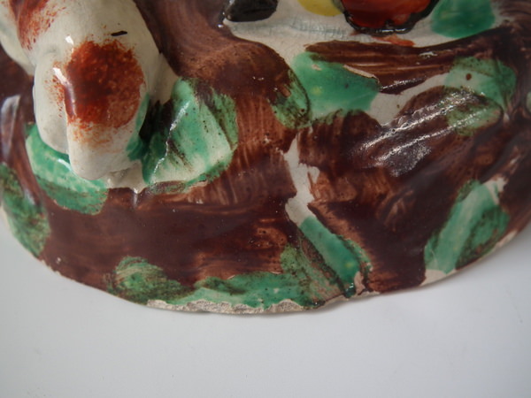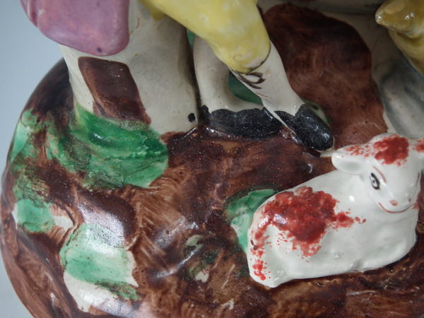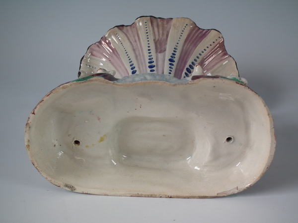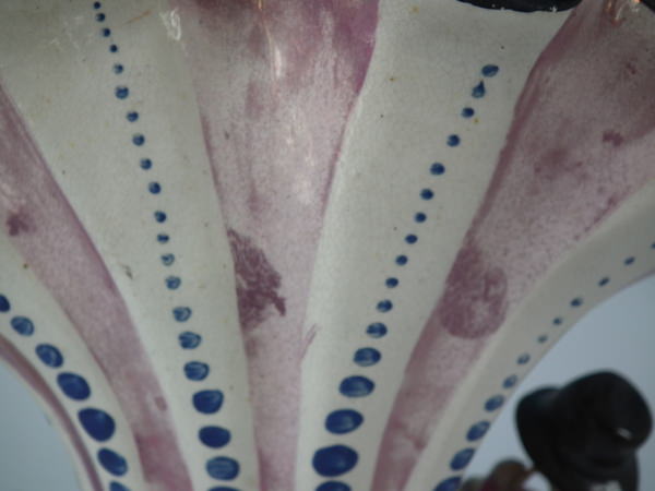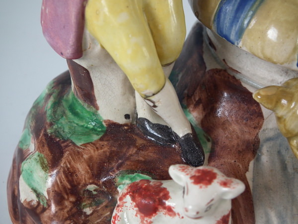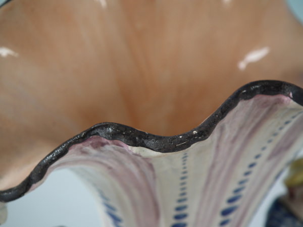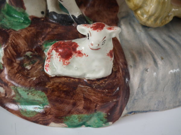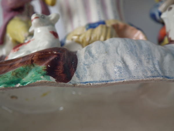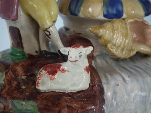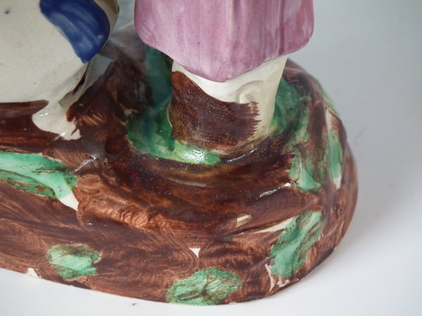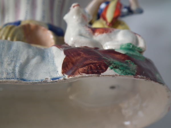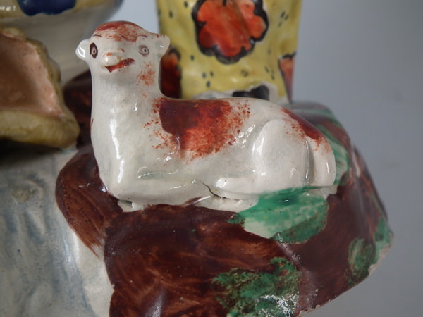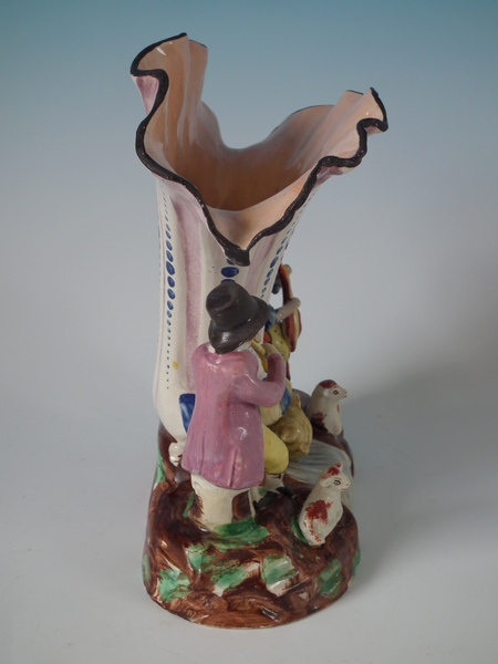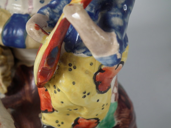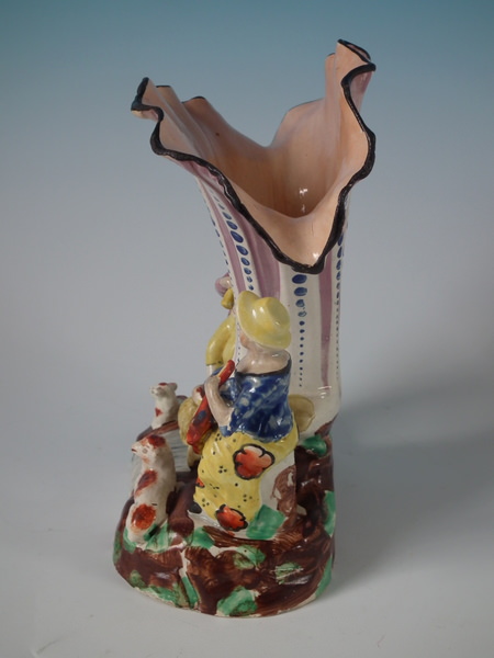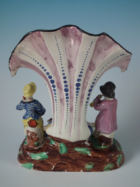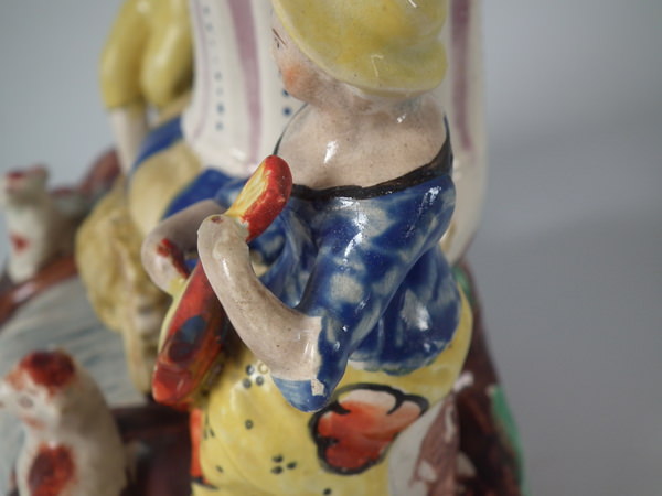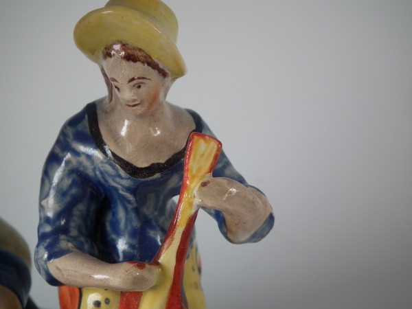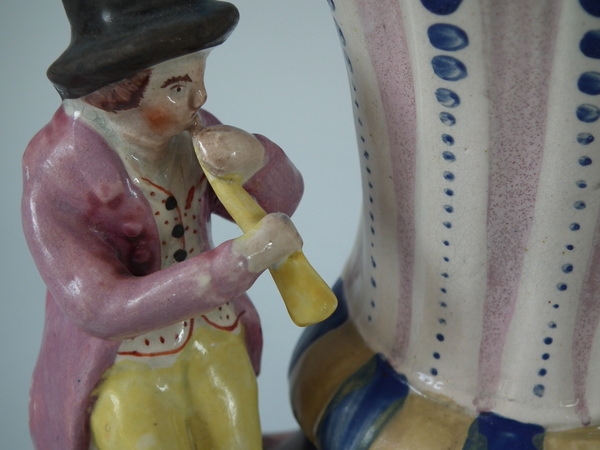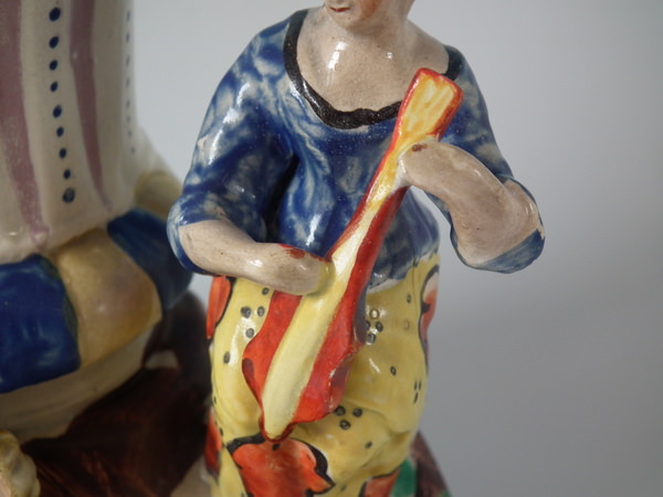 pre-Victorian, circa 1820. 8.9ins high, 7.2ins wide, 3.8ins depth. Staffordshire pearlware spill vase with a musical theme which features a lady and gentleman playing musical instruments.