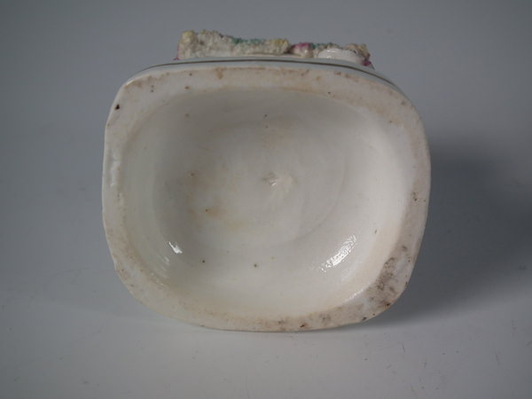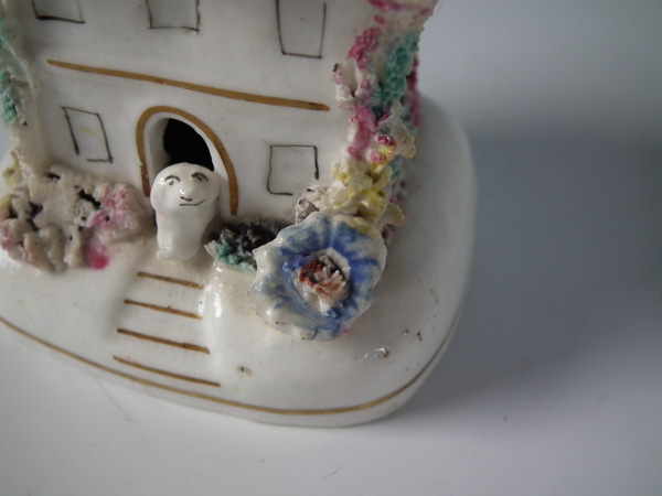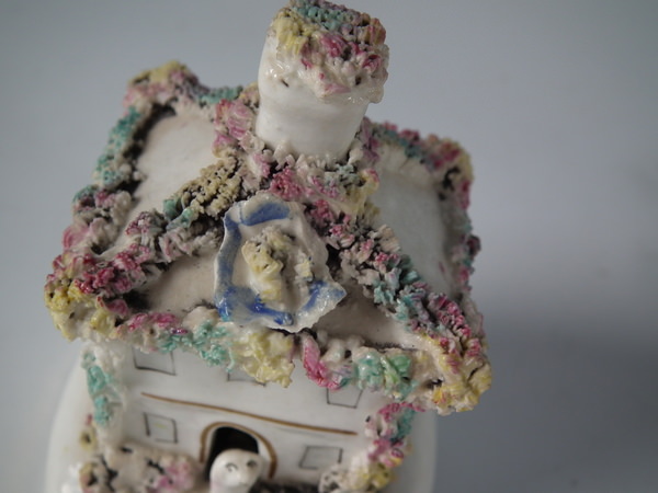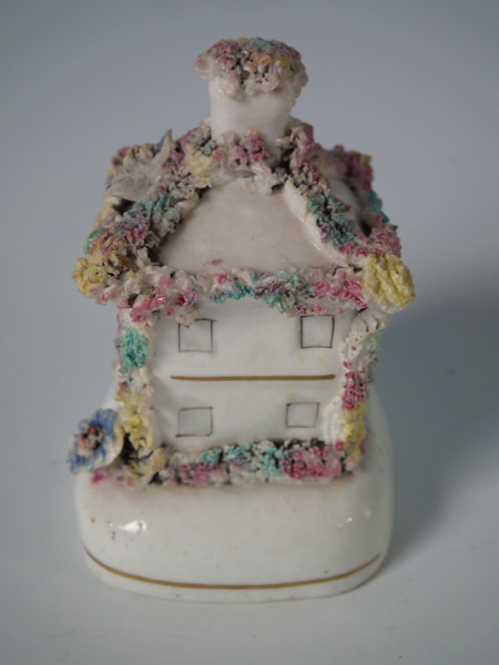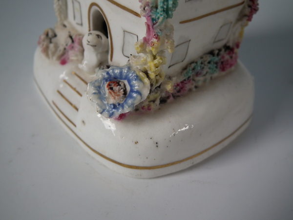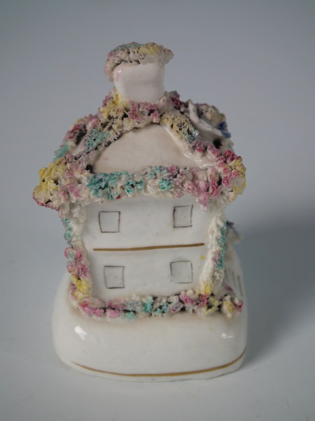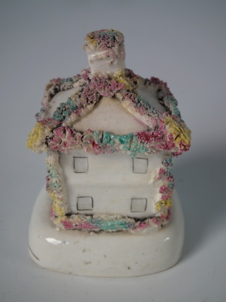 Victorian, circa 1860. 3.3ins high, 2.6ins wide, 2.4ins depth. Staffordshire cottage which features a dog sitting in the doorway, stood on a square base.
