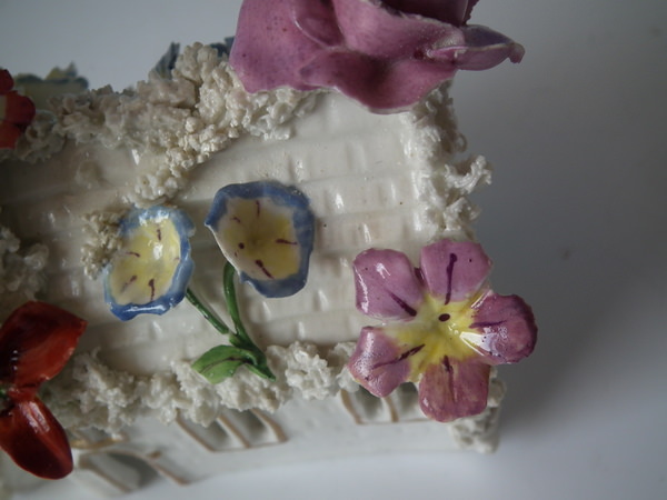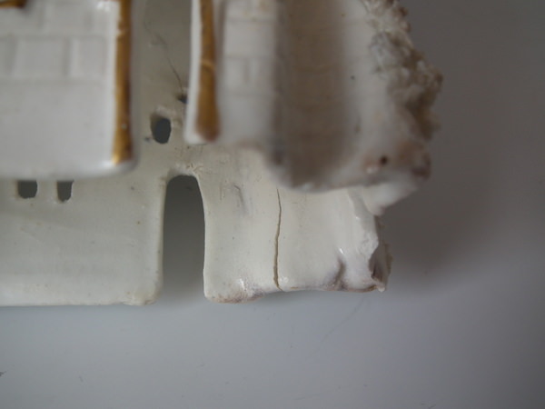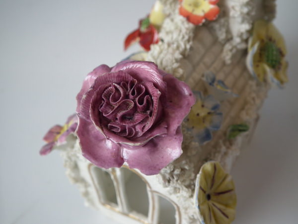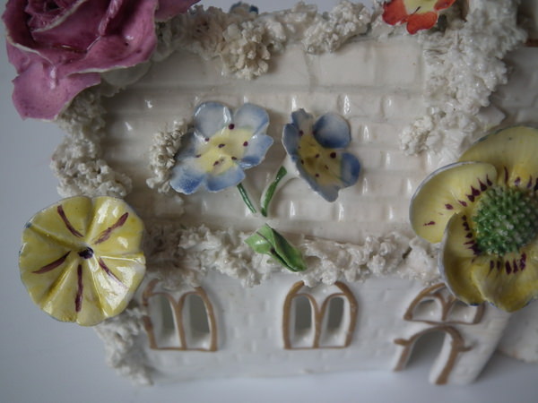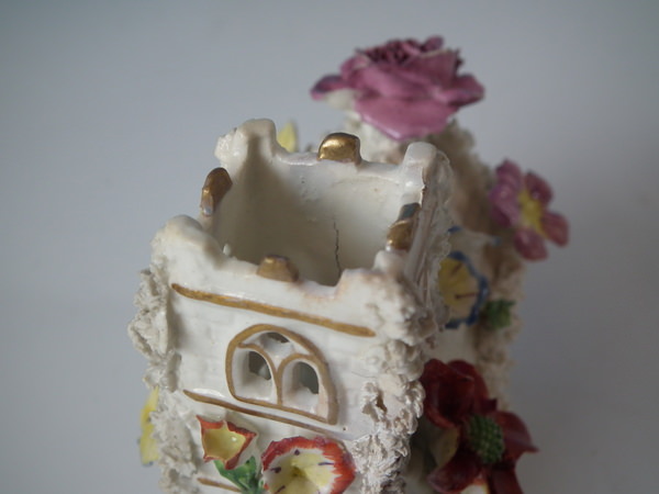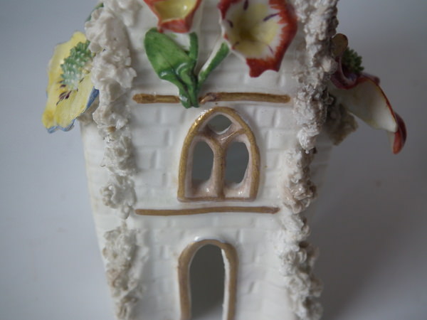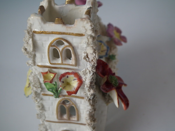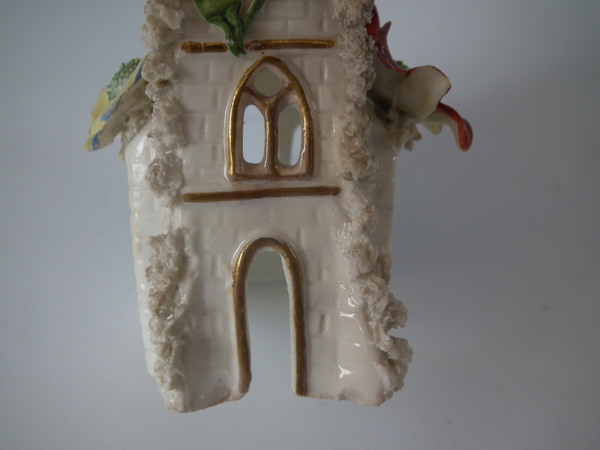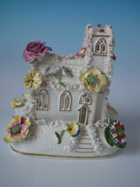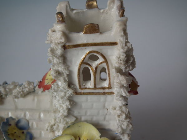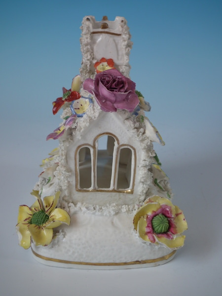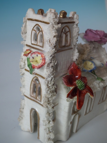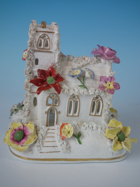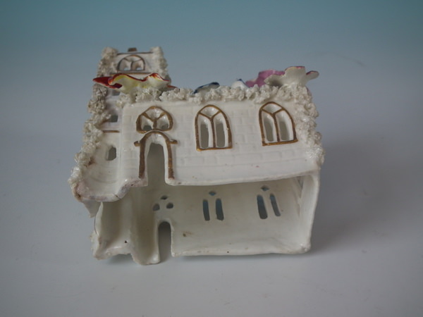 Victorian, circa 1860. 5.5ins high, 5.3ins wide, 4.1ins depth. Staffordshire pastille burner which features a church adorned with flowers, stood on a rectangular detachable base.