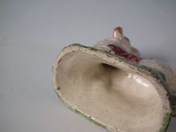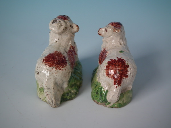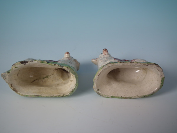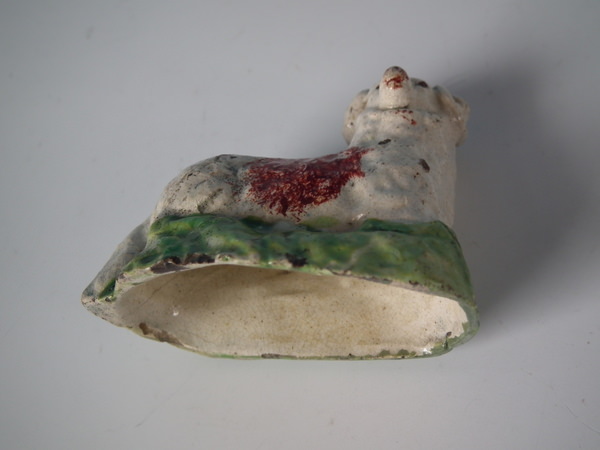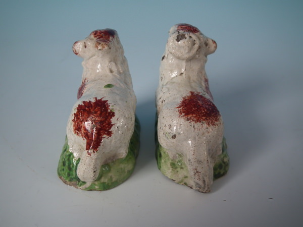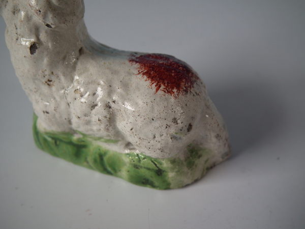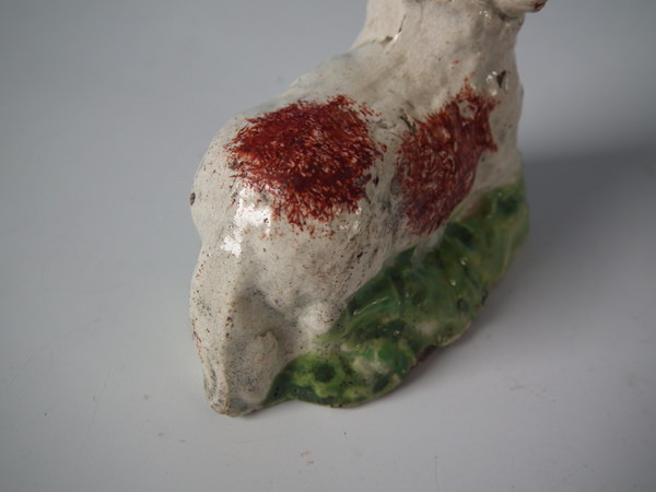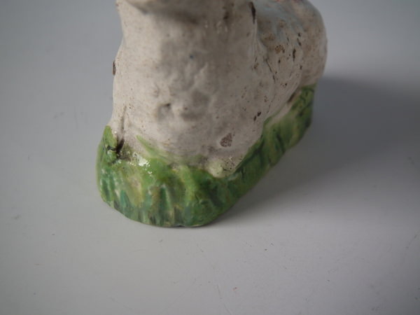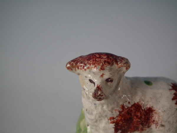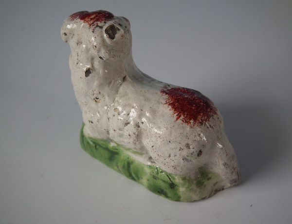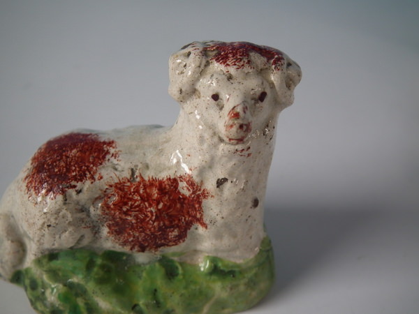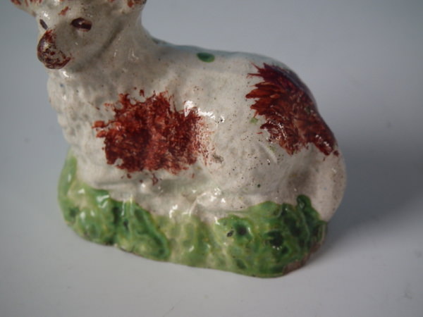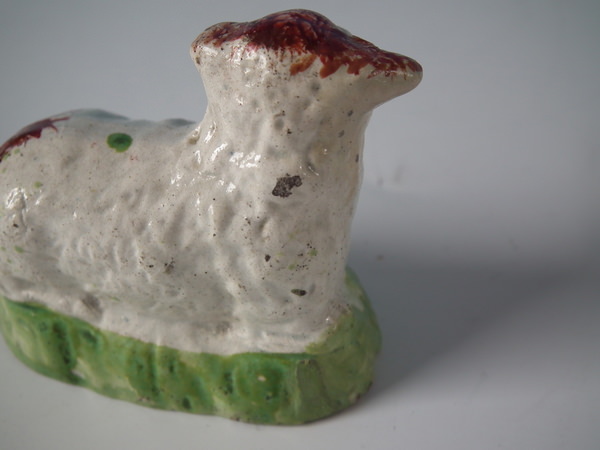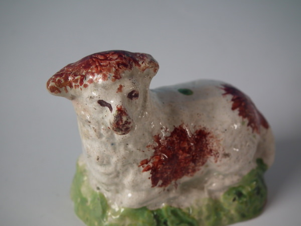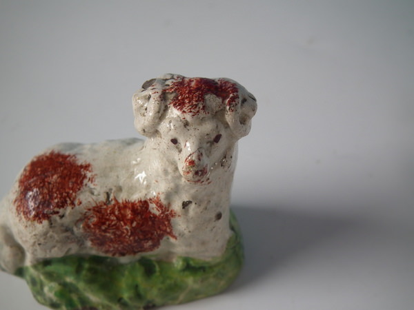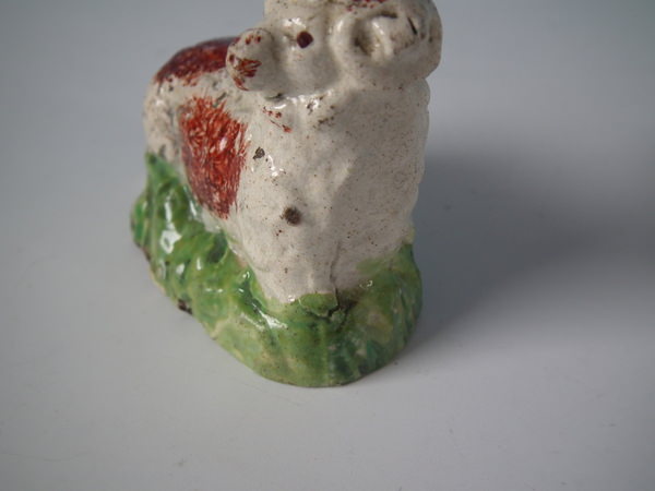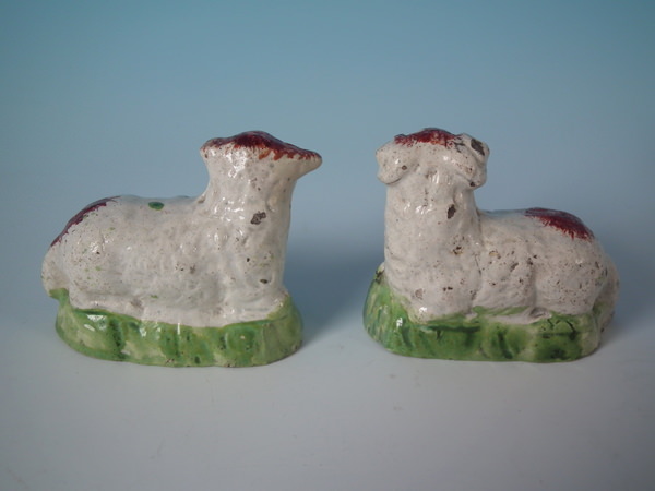 pre-Victorian, circa 1820. Tallest is 1.9ins high, 2.4ins wide, 1.3ins depth. Pair of Staffordshire pearlware figures which feature a ram and a ewe, recumbent on a shaped hollow base.