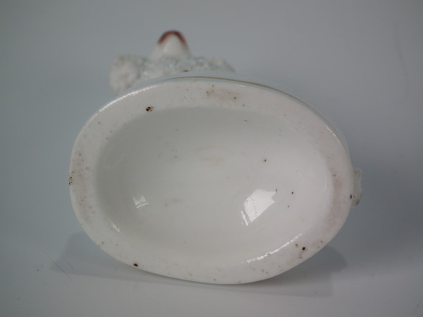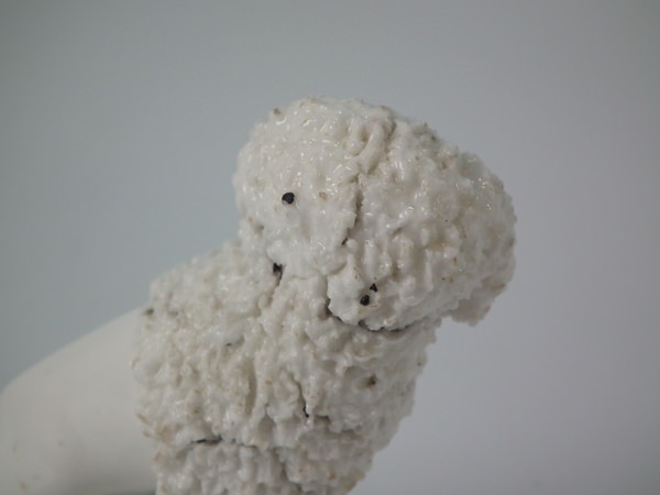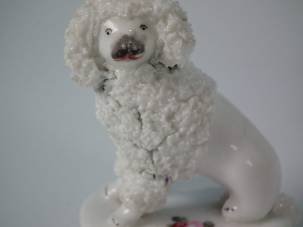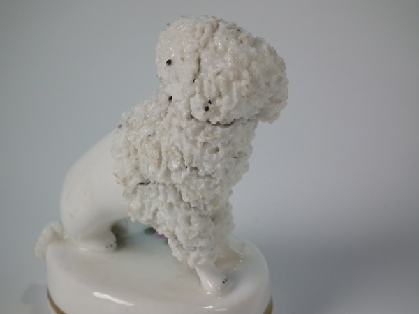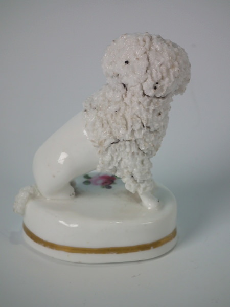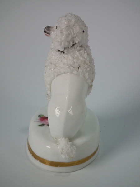 Victorian, circa 1860. 3ins high, 2.4ins wide, 1.8ins depth. Staffordshire porcellaneous figure which features a poodle and painted flower, seated on an oval base.