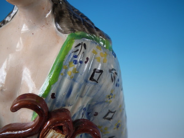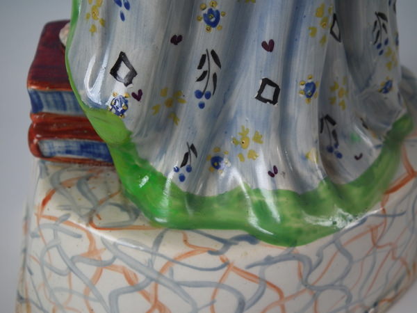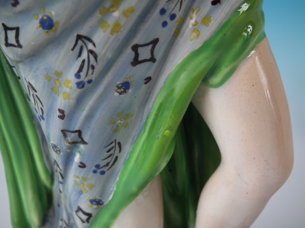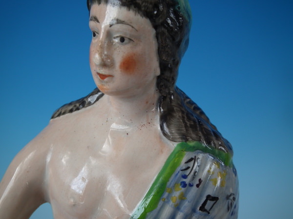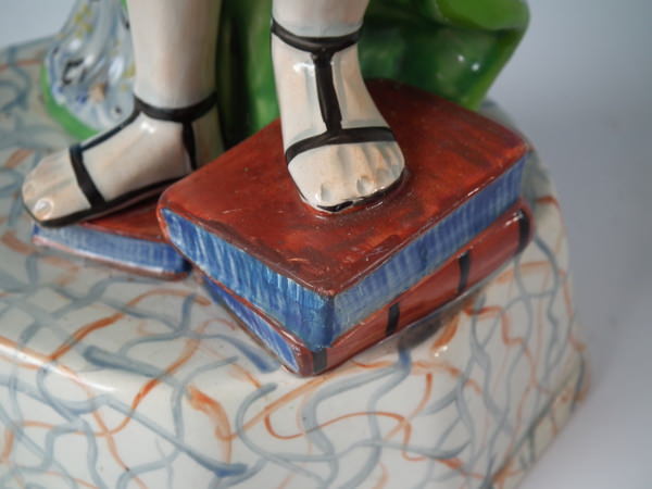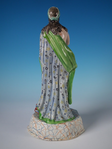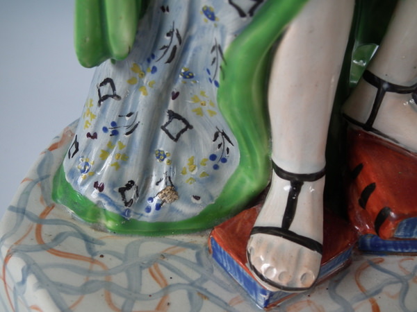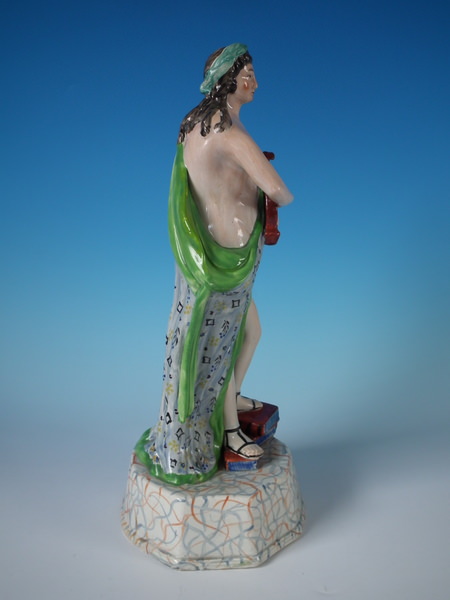 pre-Victorian, circa 1800. 13.8ins high, 6.5ins wide, 5.1ins depth. Staffordshire pearlware figure with a mythological theme which features Apollo playing the lyre, stood on a plinth base.