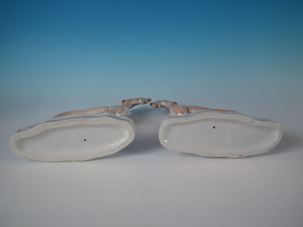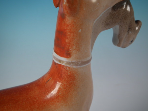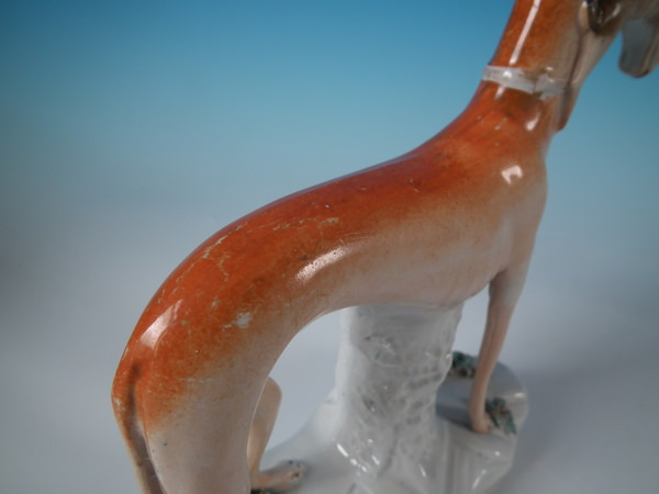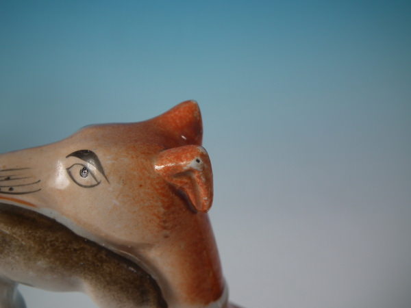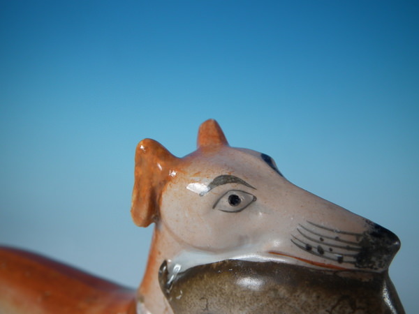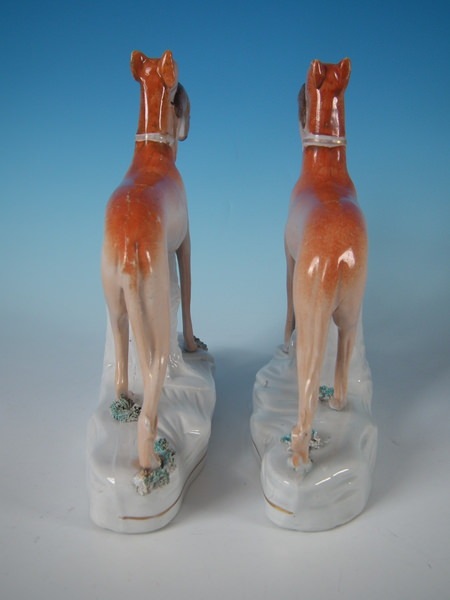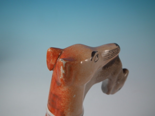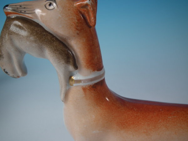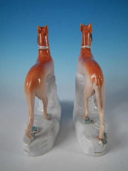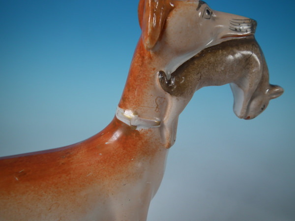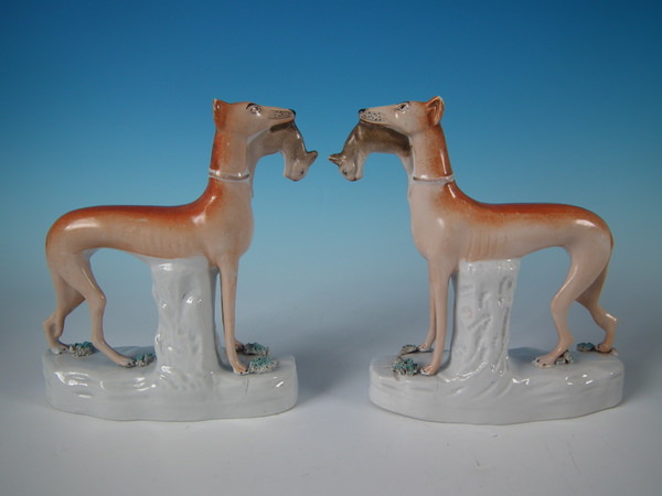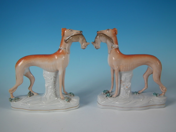 Victorian, circa 1860. Tallest is 7.7ins high, 8.1ins wide, 2.5ins depth. Pair of Staffordshire figures which feature a whippet with a hare in it's mouth, stood on a shaped base.