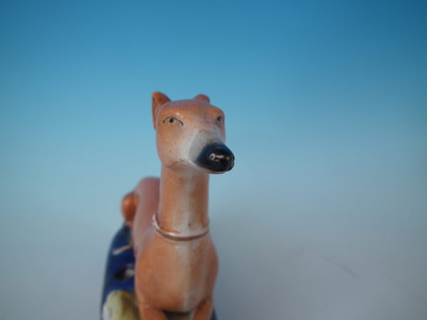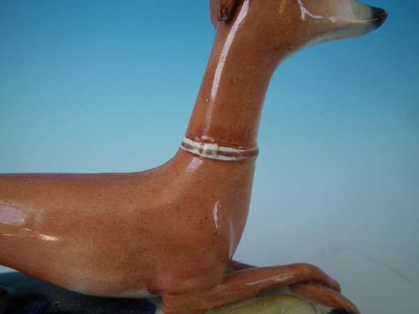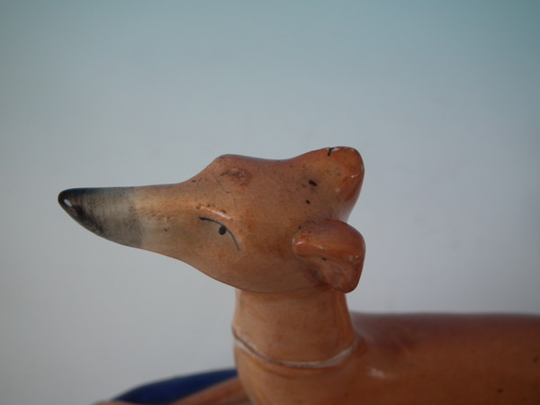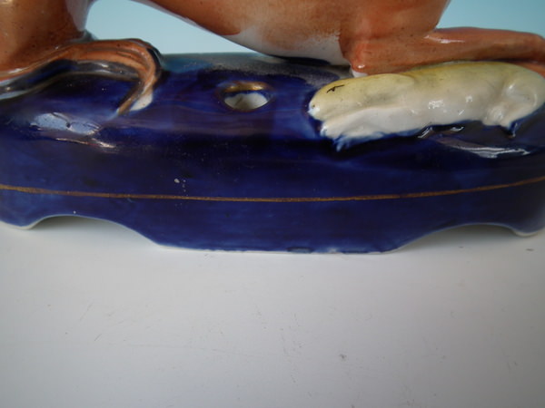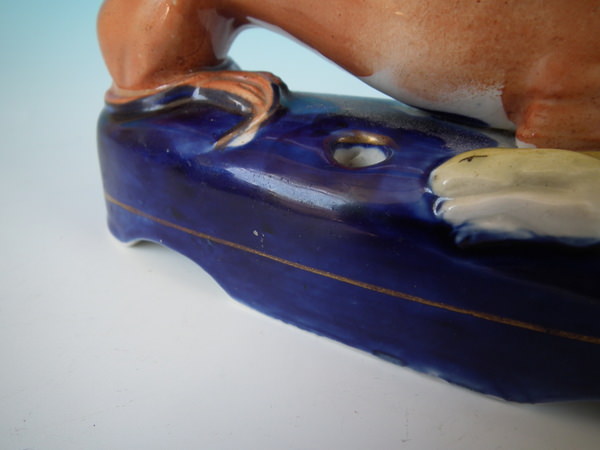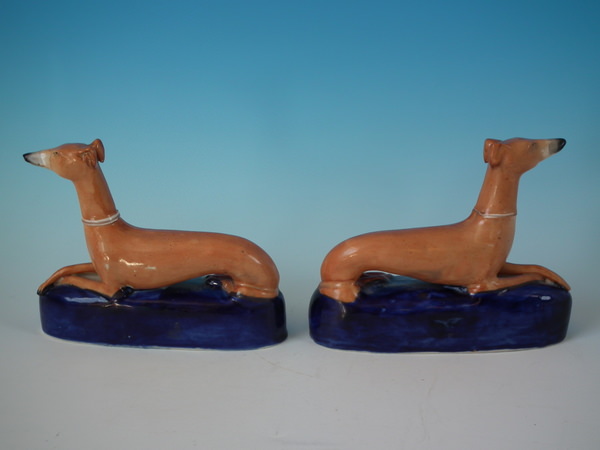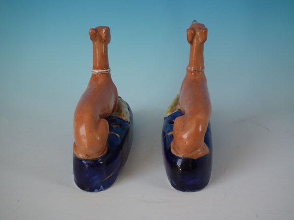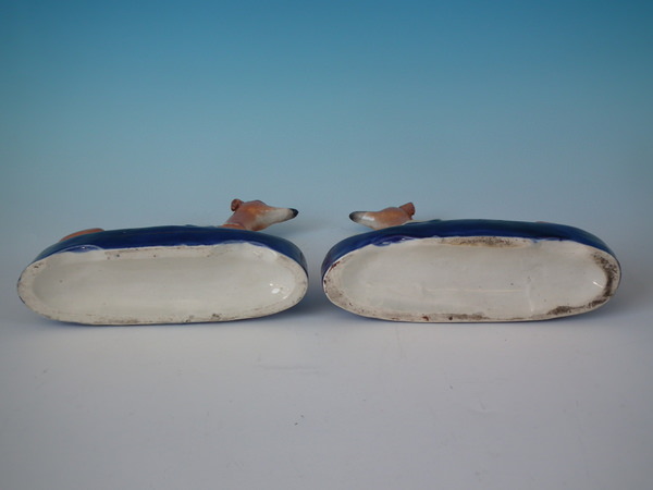 Victorian, circa 1860. Tallest is 5.5ins high, 6.9ins wide, 2.2ins depth. Pair of Staffordshire inkwells which feature a whippet with hare, recumbent on a shaped base.