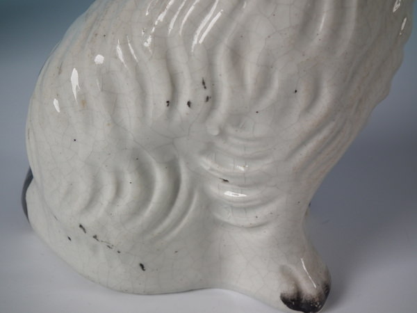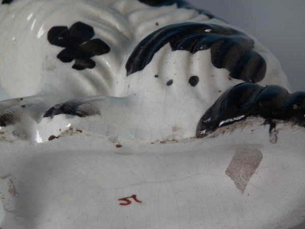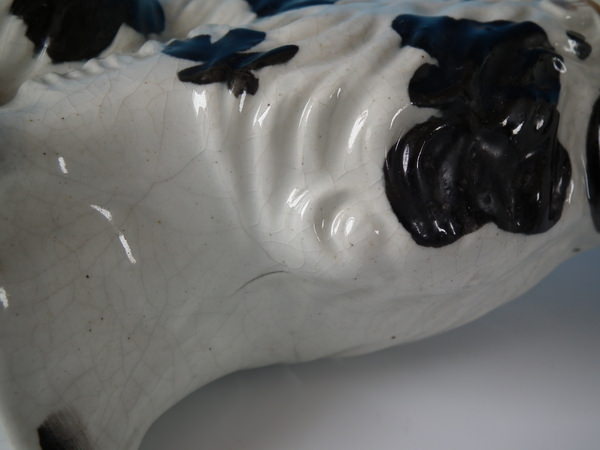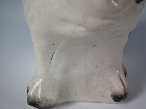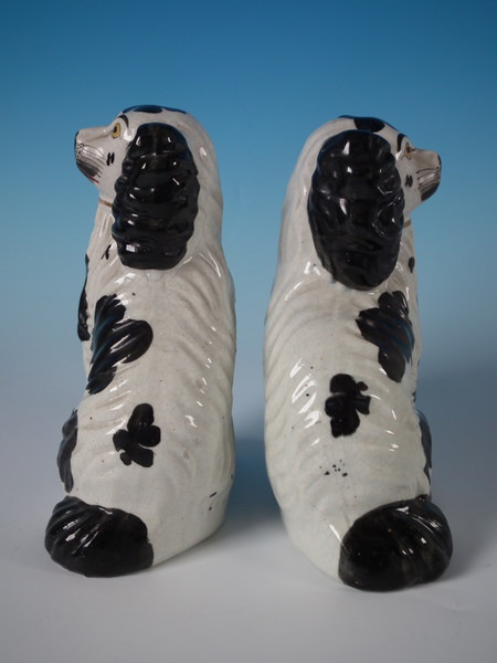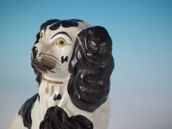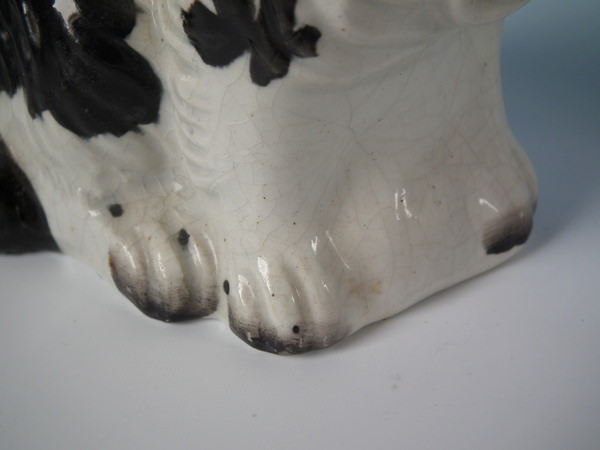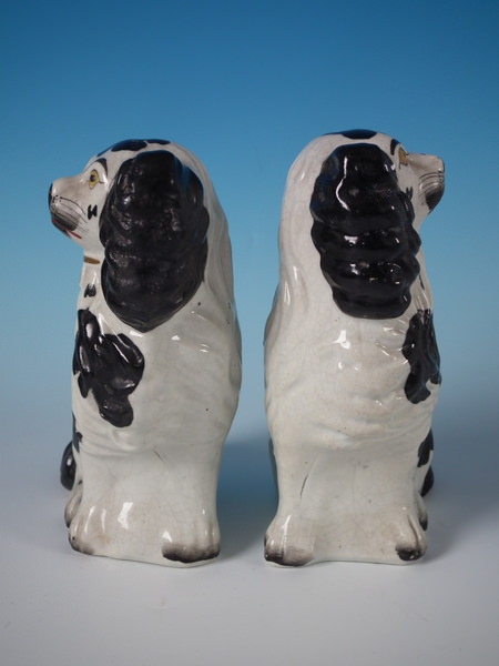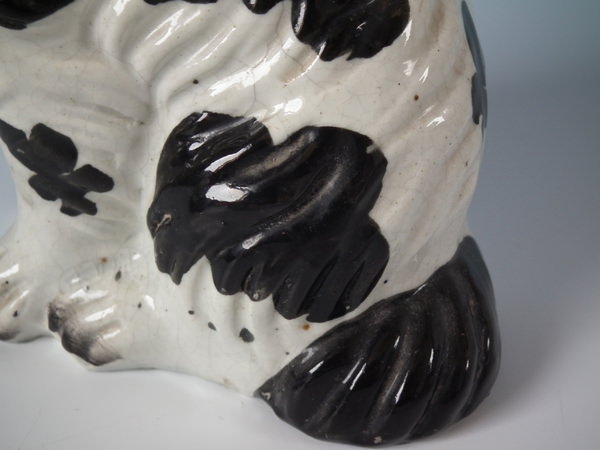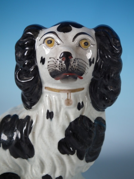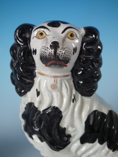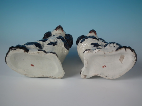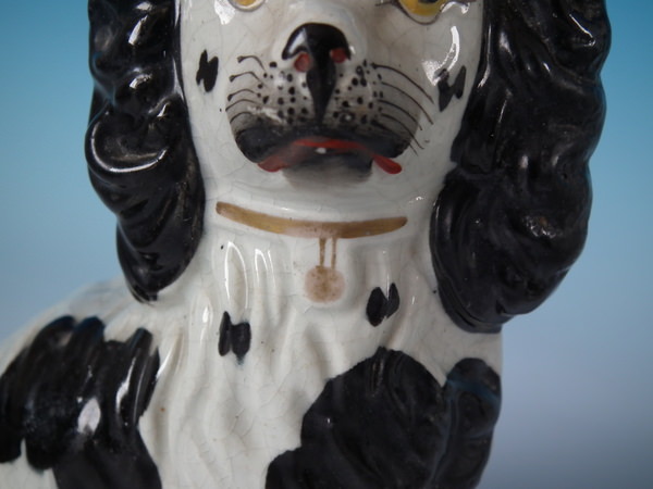 Victorian, circa 1860. Tallest is 6.5ins high, 4.7ins wide, 3ins depth. Pair of Staffordshire figures which feature a spaniel, seated directly on the ground, no base.