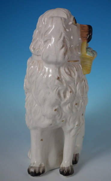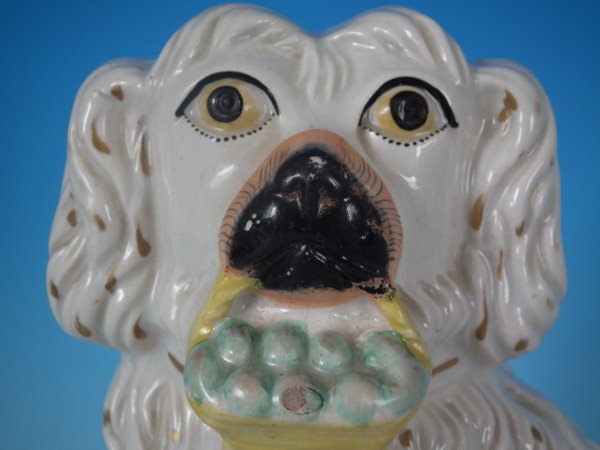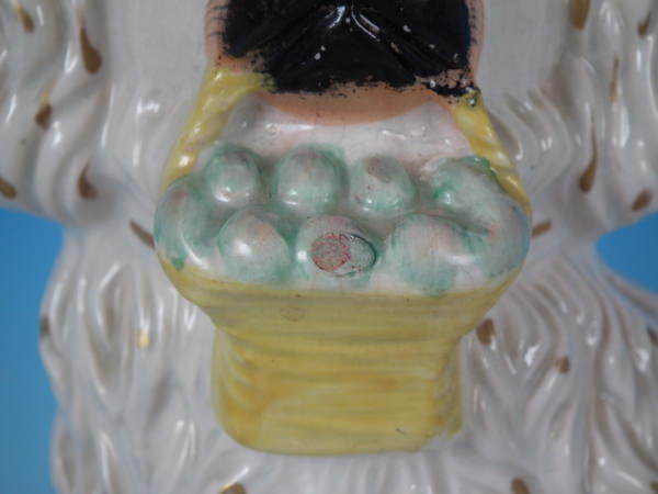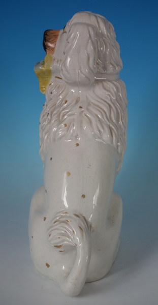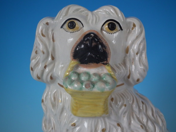 Victorian, circa 1860. 11.2ins high, 8.3ins wide, 4.1ins depth. Staffordshire figure which features a Little Lion Dog holding a fruit basket in its mouth, seated directly on the ground, no base. Dull gilt embellishment. Decorated mainly to the front.