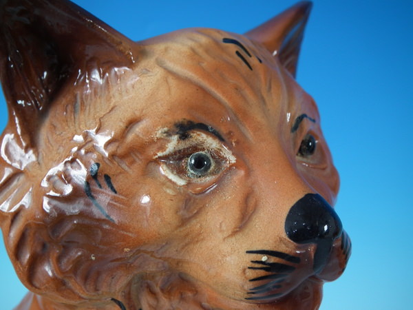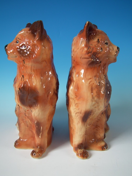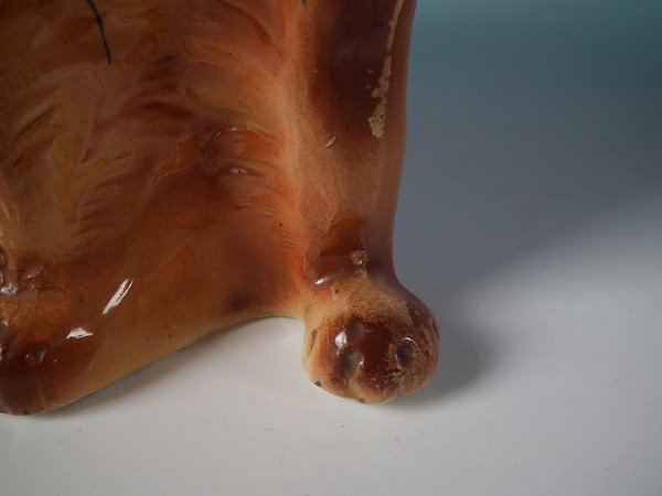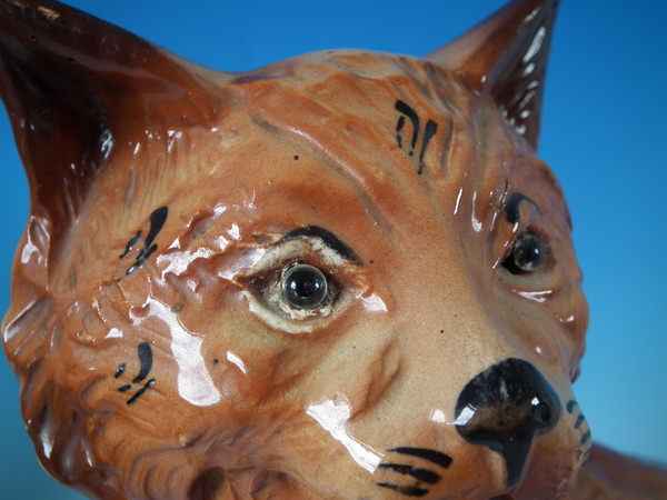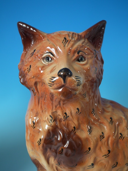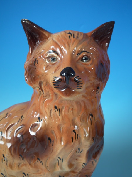 Victorian, circa 1890. Tallest is 12.7ins high, 9.4ins wide, 4.7ins depth. Pair of Staffordshire figures which feature a ginger cat with glass eyes, stood directly on the ground, no base.