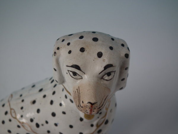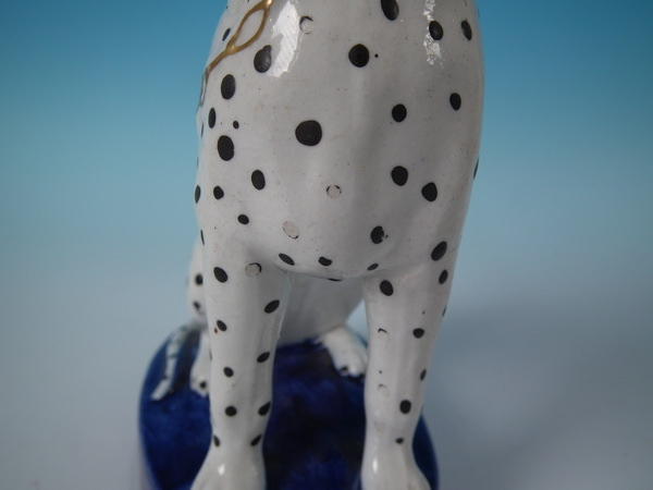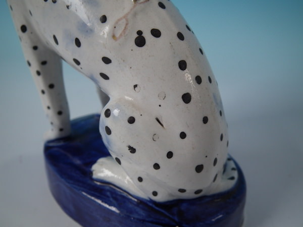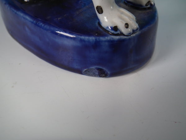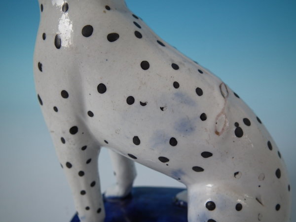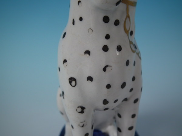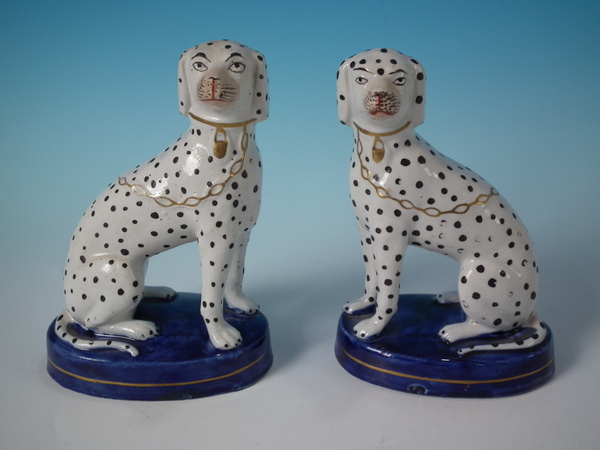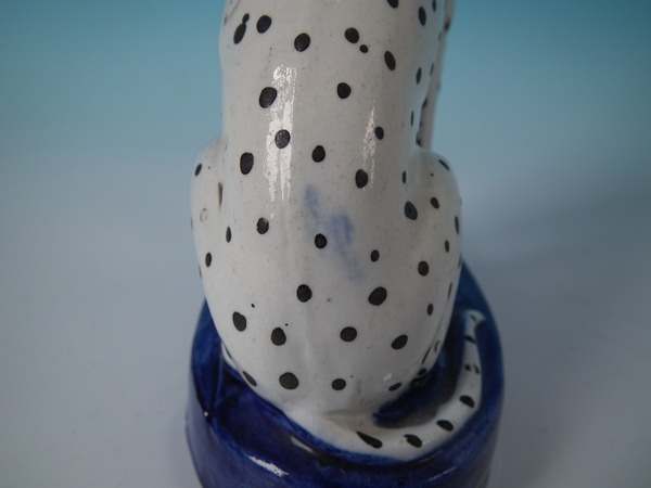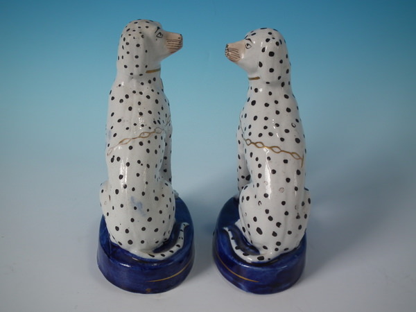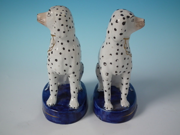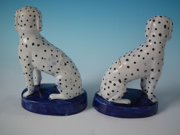 Victorian, circa 1860. Tallest is 6.3ins high, 4.4ins wide, 2.8ins depth. Pair of Staffordshire figures which feature a Dalmatian, seated on a cobalt blue base.