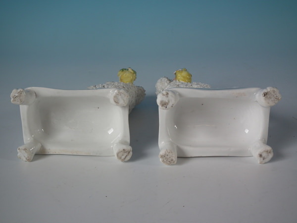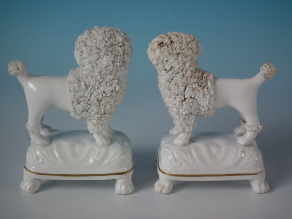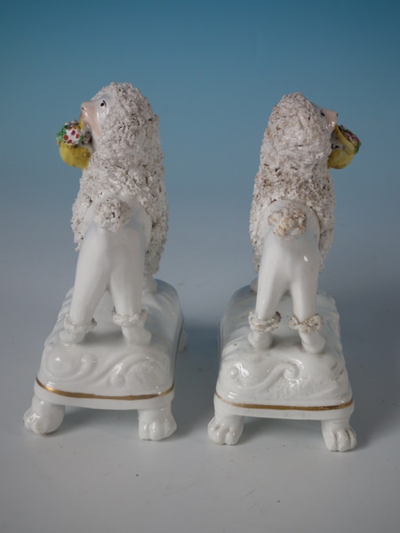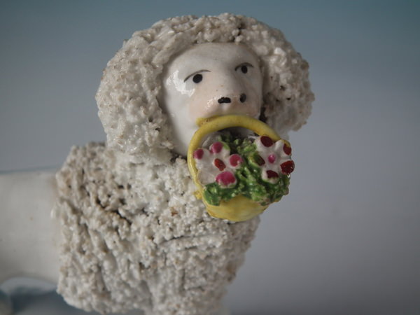 Victorian, circa 1850. Tallest is 4.5ins high, 3.3ins wide, 2ins depth. Pair of Staffordshire figures which feature a poodle with a flower basket in it's mouth, stood on a footstool base.
