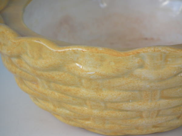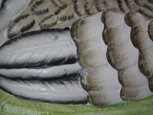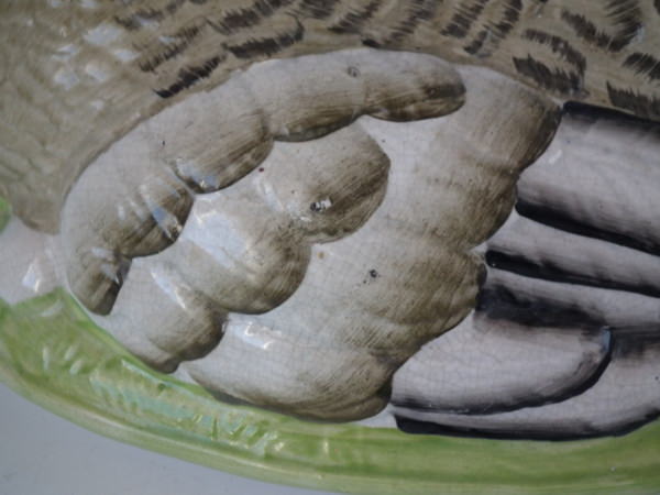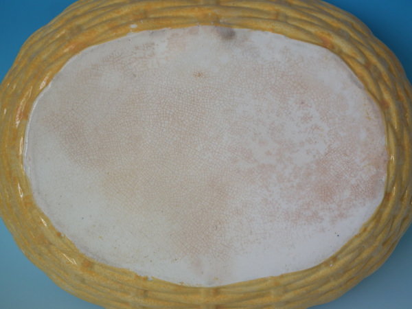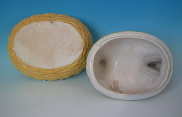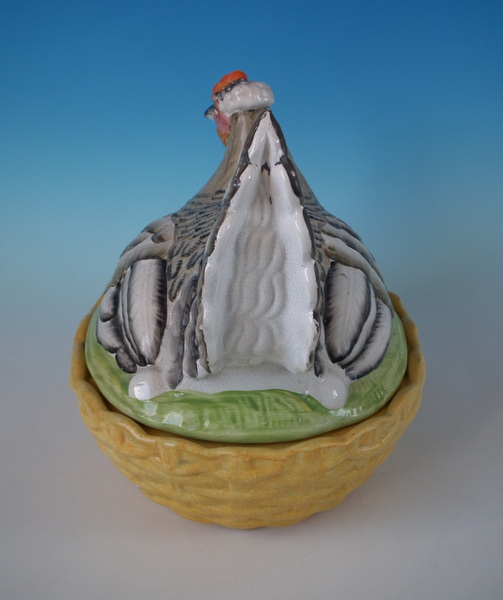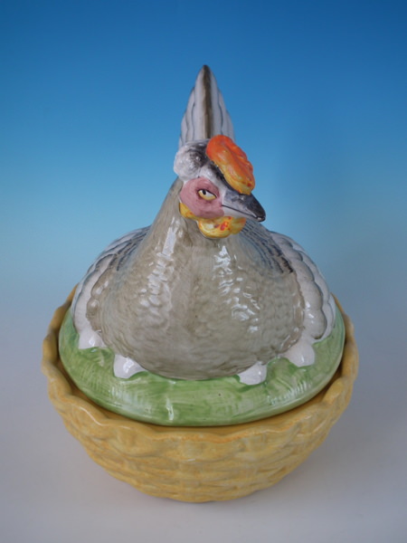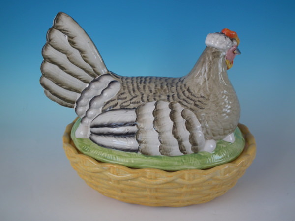 Staffordshire egg tureen and cover which features a hen, resting on an oval basketweave tureen base.