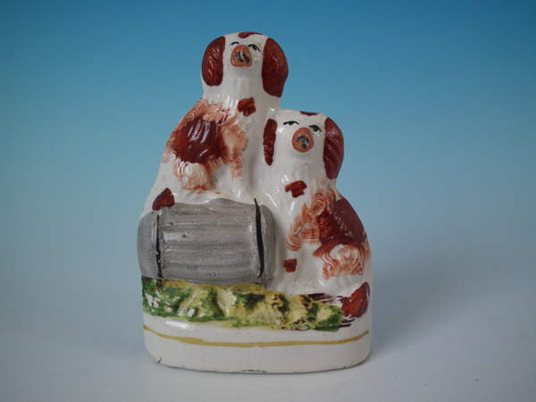 Victorian, circa 1860. 4.4ins high, 3.3ins wide, 1.6ins depth. Staffordshire group which features two spaniels with a barrel, seated on a shaped base.