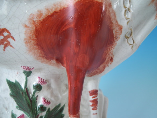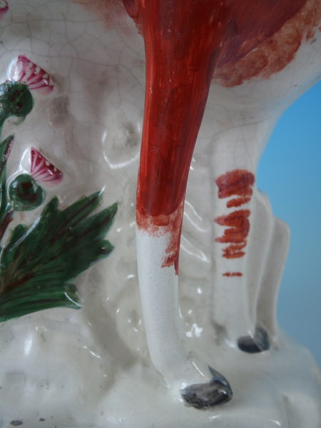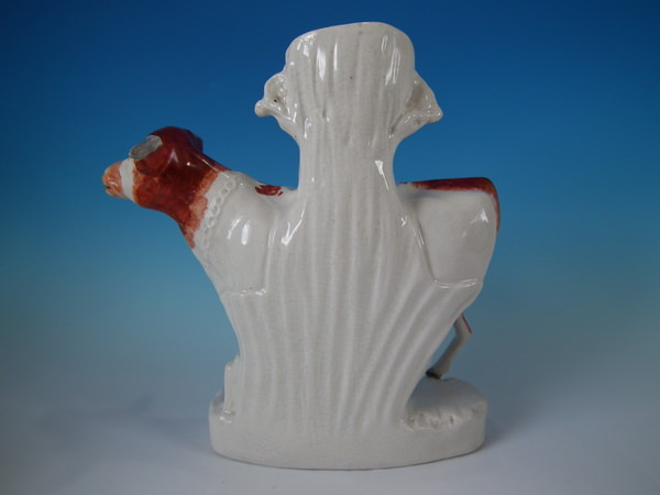 Victorian, circa 1860. 14.4ins high, 10.4ins wide, 4.1ins depth. Staffordshire spill vase with a pastoral theme which features a cow, stood on an oval base.