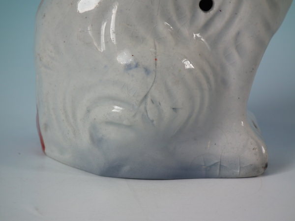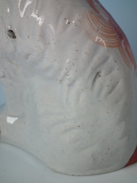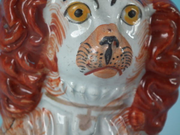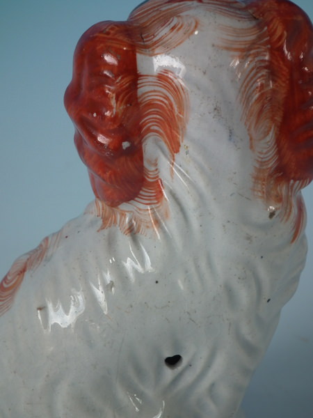 Pair of Staffordshire figures which feature a spaniel, seated directly on the ground, no base.