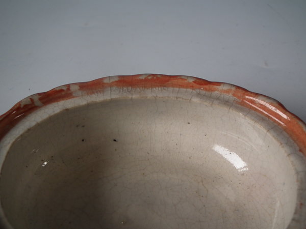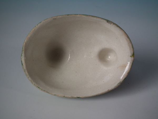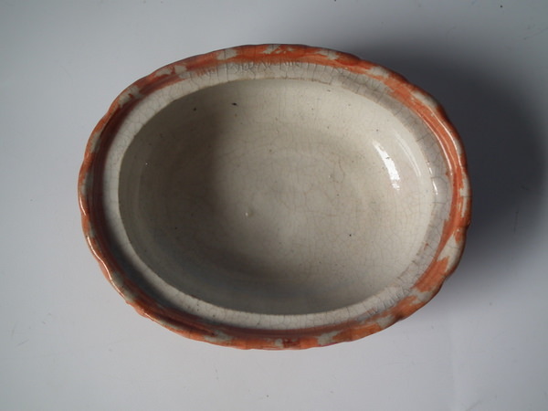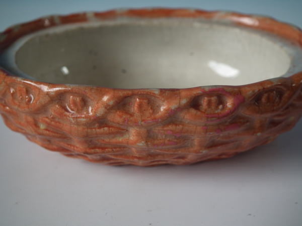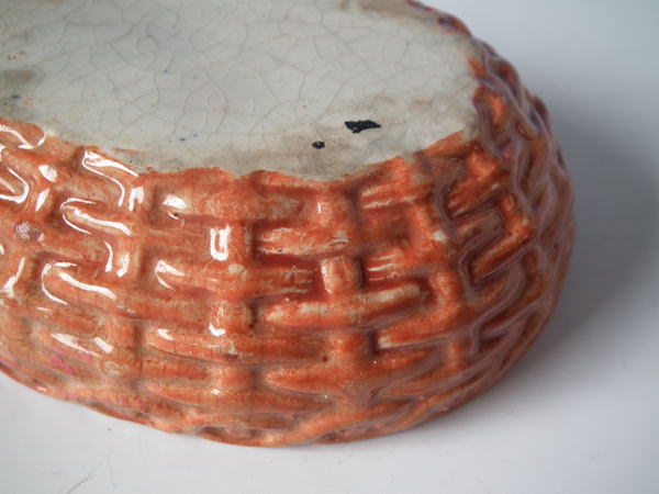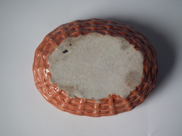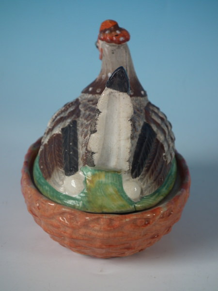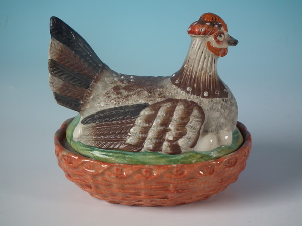Victorian, circa 1860. 4.3ins high, 4.7ins wide, 3.6ins depth. Staffordshire egg tureen and cover which features a hen sitting on her eggs on an oval basket weave tureen, resting on an oval base.