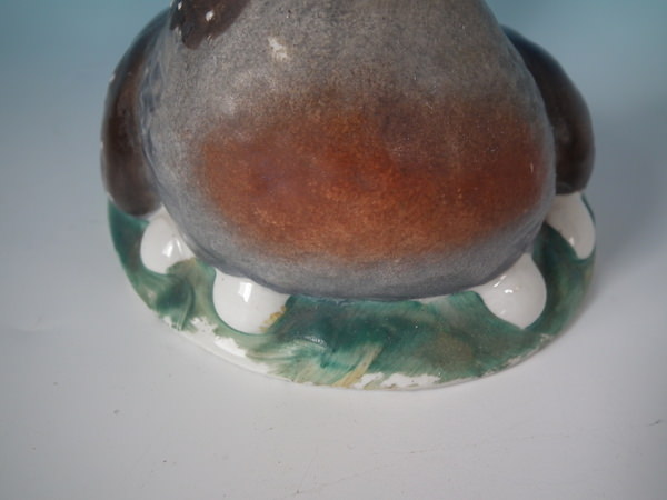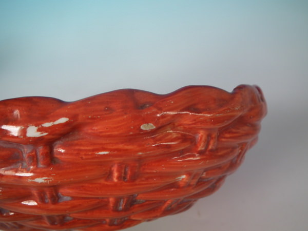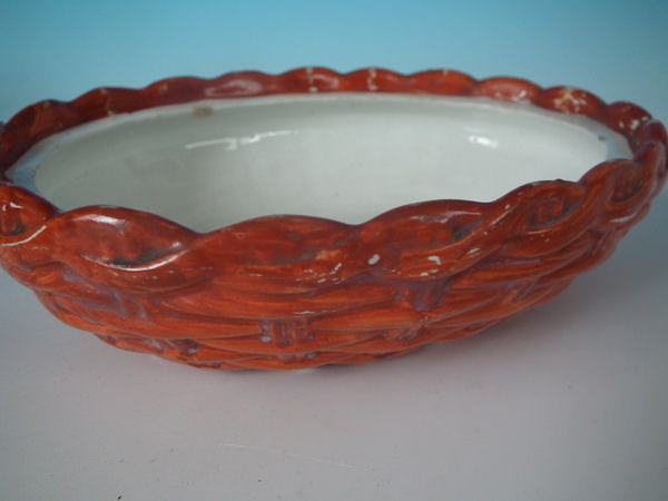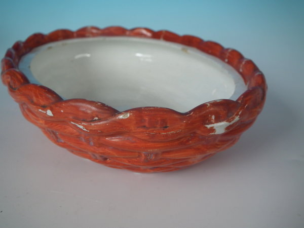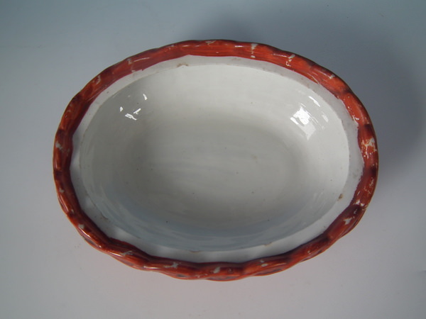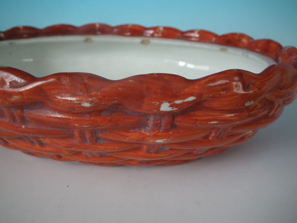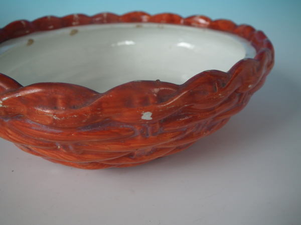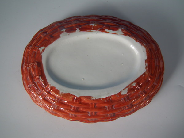 sitting on her eggs on an oval basketweave tureen, resting on an oval basketweave tureen base.