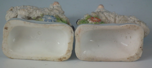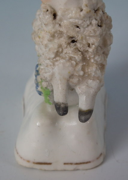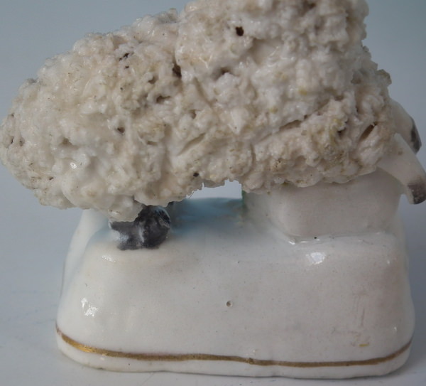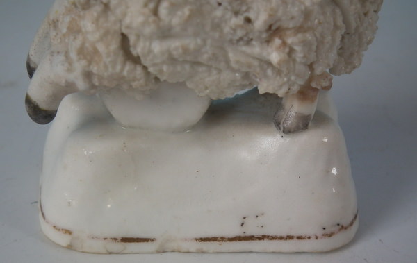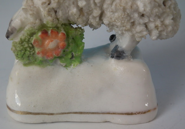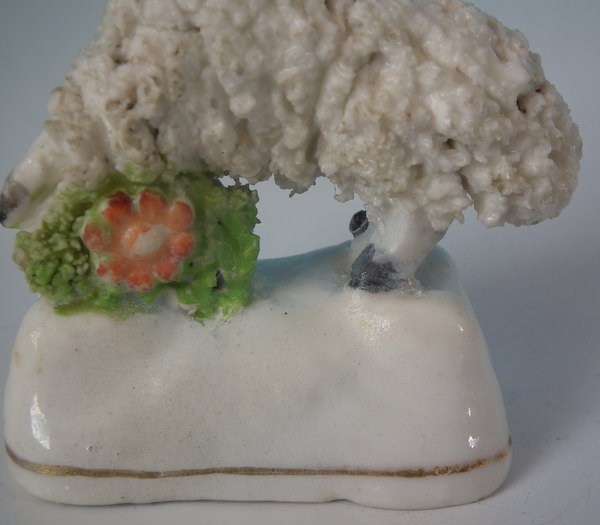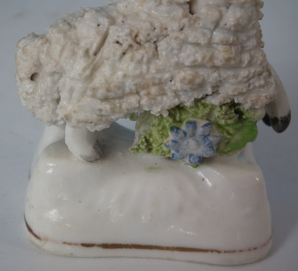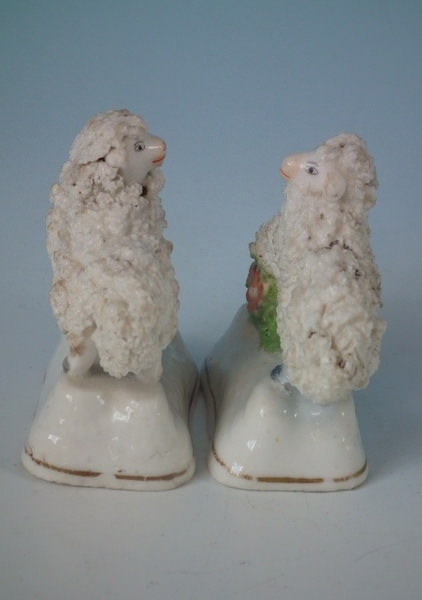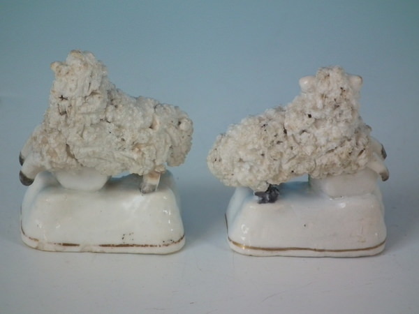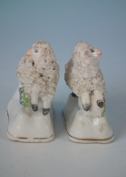 Victorian, circa 1860. Tallest is 2.2ins high, 1.2ins wide, 1.1ins depth. Pair of Staffordshire figures which feature a sheep leaping over a hedge, stood on a rectangular base. Dull gilt base line.
