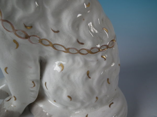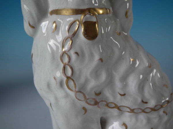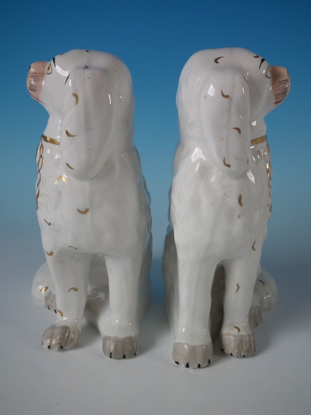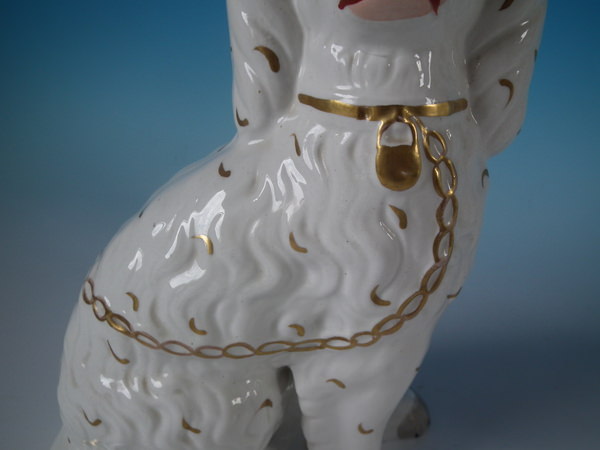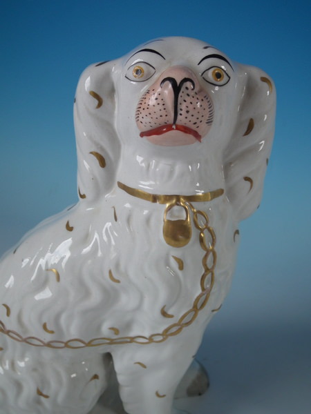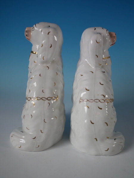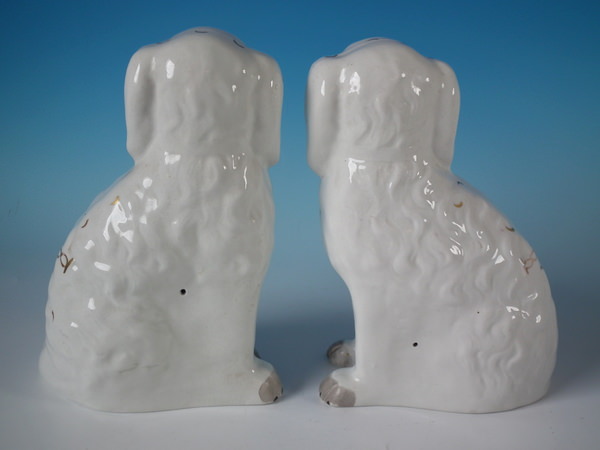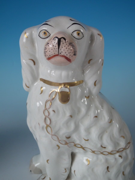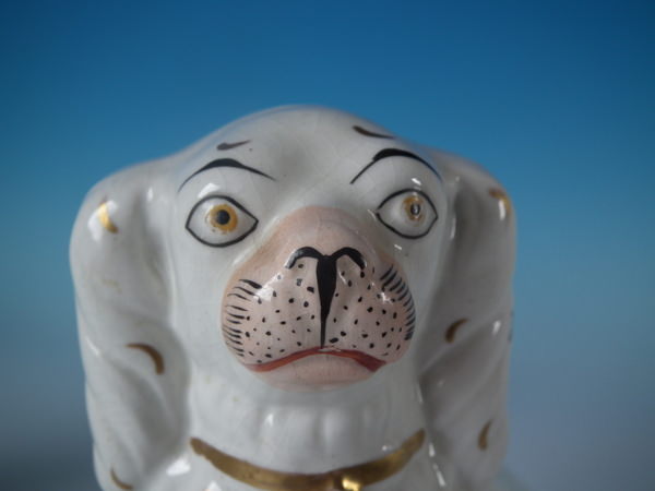 Victorian, circa 1860. Tallest is 8.5ins high, 6.3ins wide, 3.7ins depth. Pair of Staffordshire figures which feature a spaniel, with front leg free, seated directly on the ground, no base.