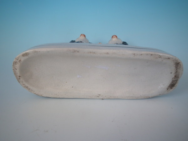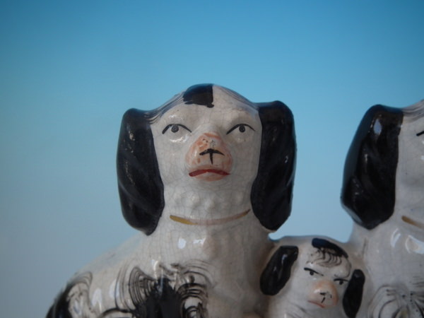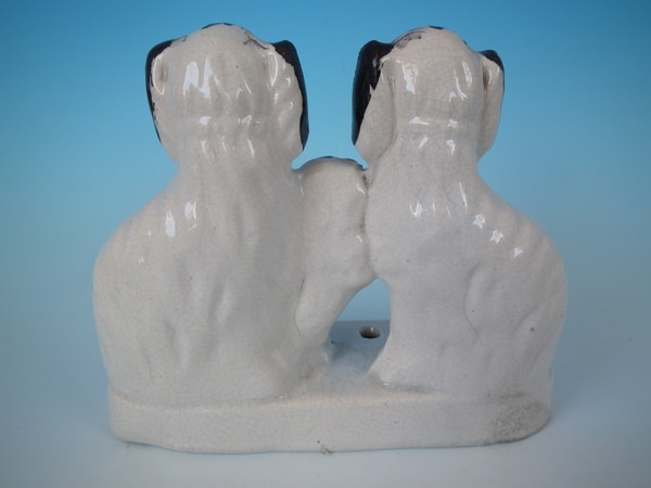 Victorian, circa 1860. 5.3ins high, 6.3ins wide, 2.4ins depth. Staffordshire inkwell which features two spaniels with a pup inbetween them, seated on an oblong base.