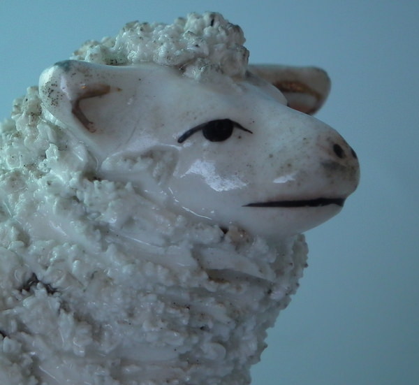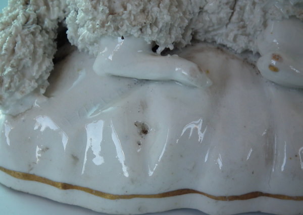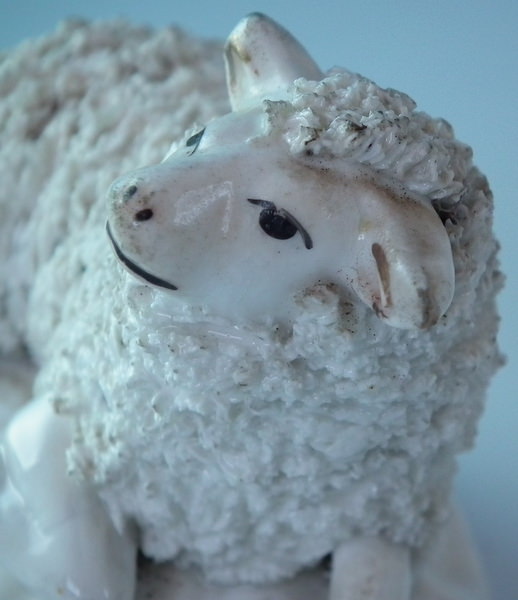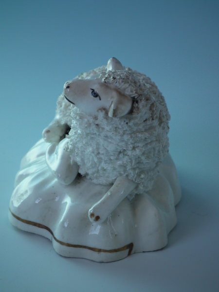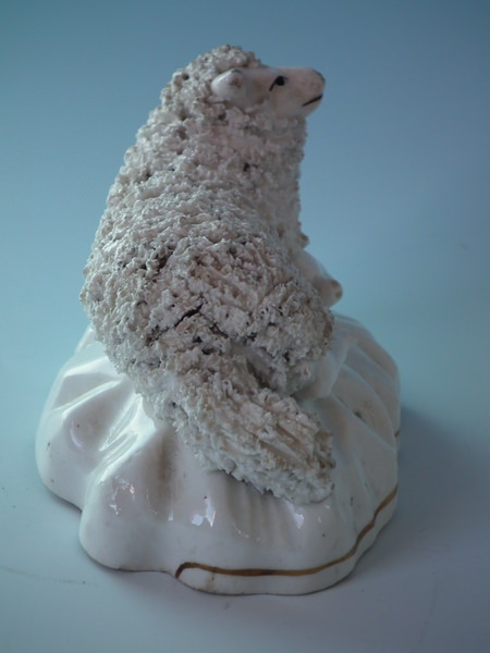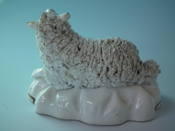 Victorian, circa 1860. 2.6ins high, 3.7ins wide, 2.6ins depth. Staffordshire porcellaneous figure which features a sheep, recumbent on a shaped base. Dull gilt base line.
