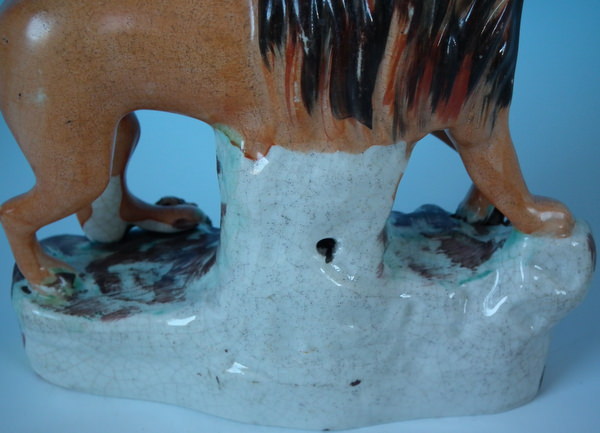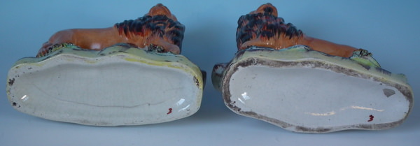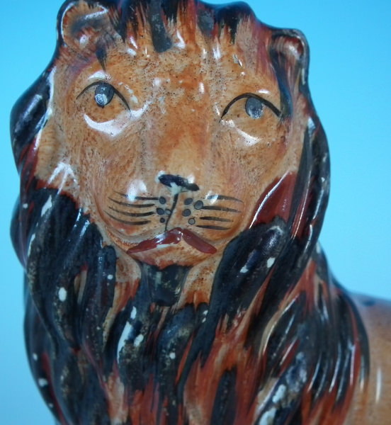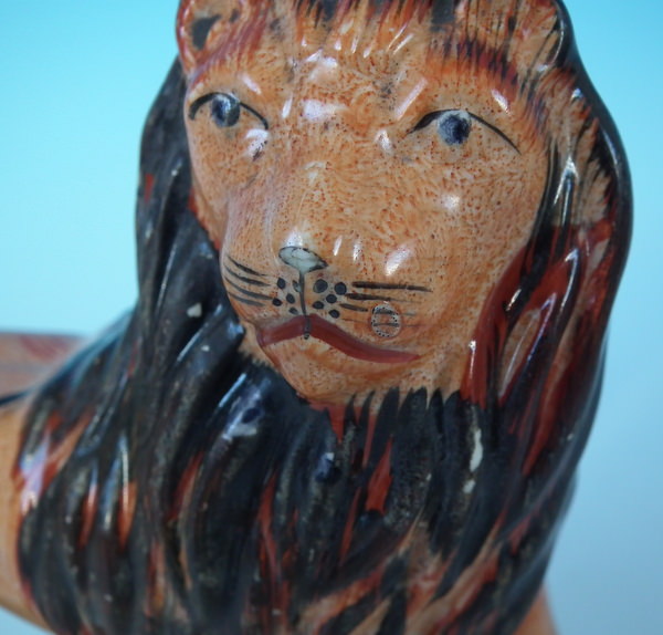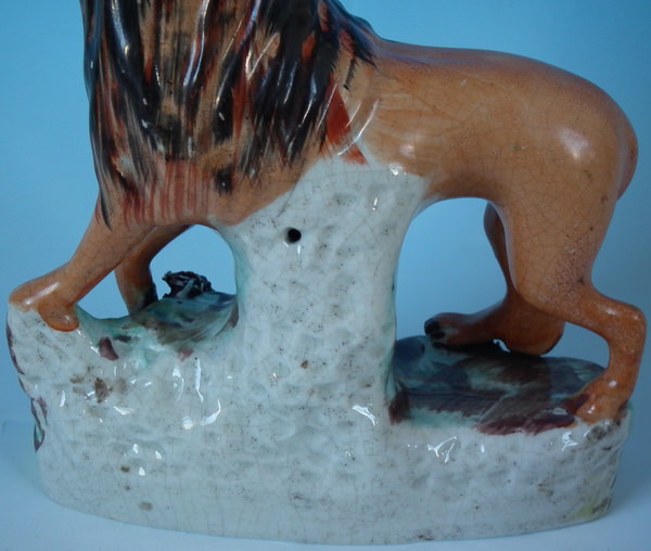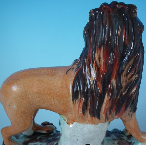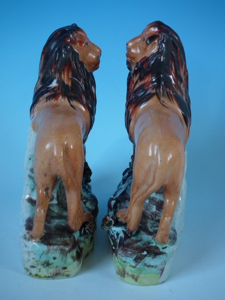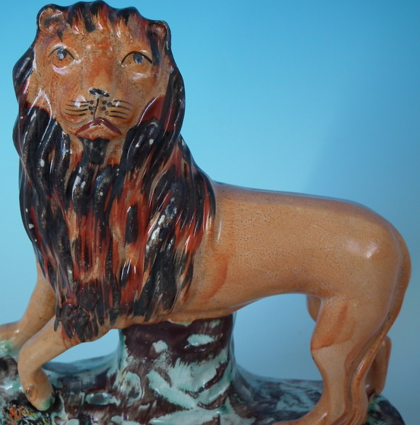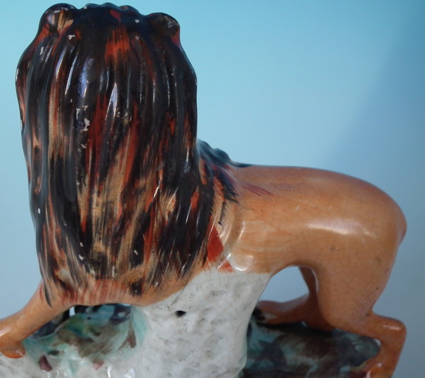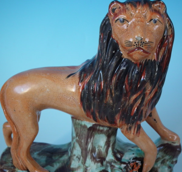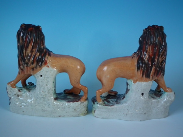 Victorian, circa 1860. Tallest is 6.9ins high, 5.9ins wide, 2.6ins depth. Pair of Staffordshire figures which feature a lion, stood on a shaped base.