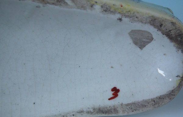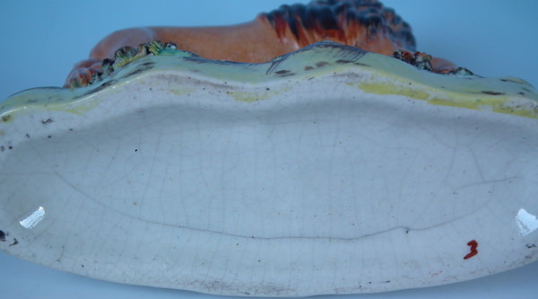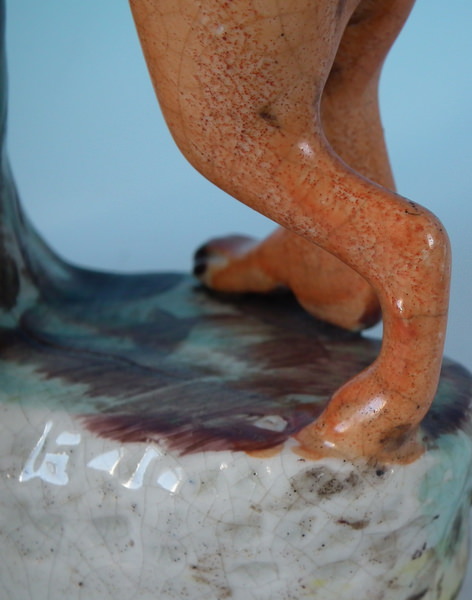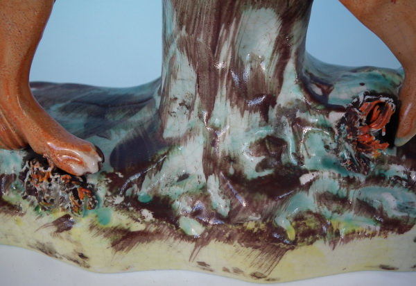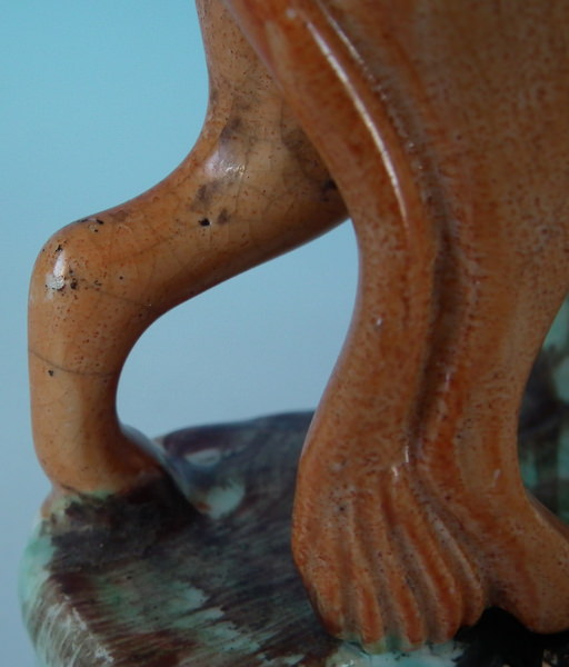 a piece of kiln detritus caught in the glaze to the lion's front left paw.