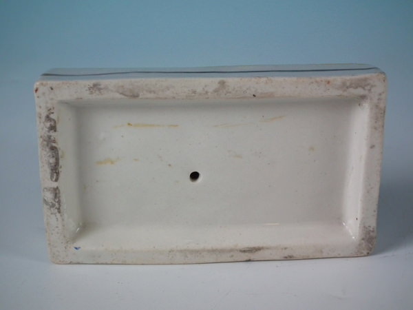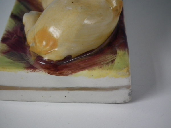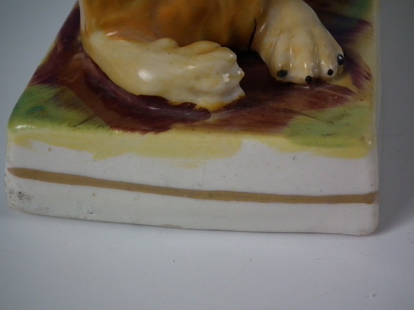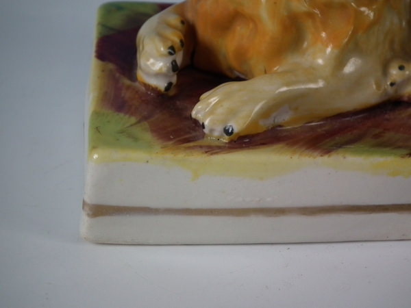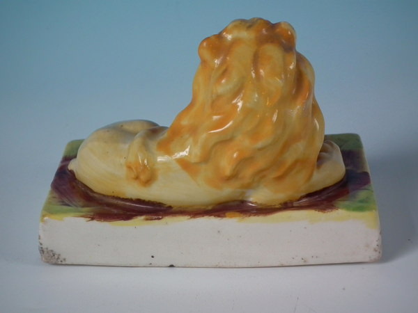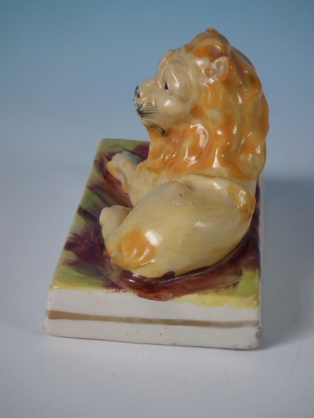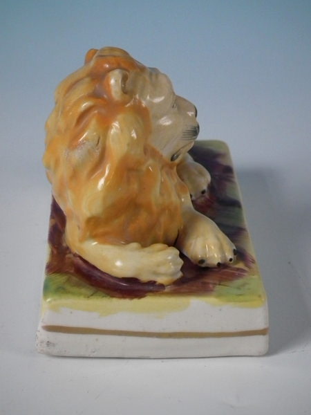 Victorian, circa 1860. 3.7ins high, 4.9ins wide, 2.9ins depth. Staffordshire figure which features a lion, recumbent on a rectangular base.