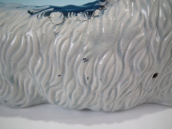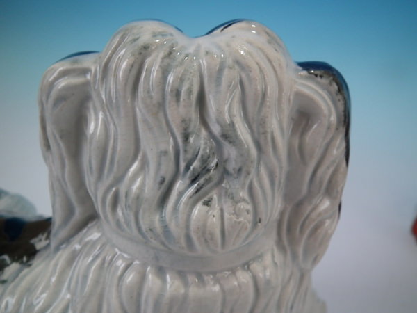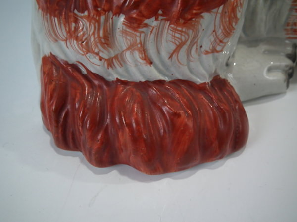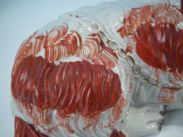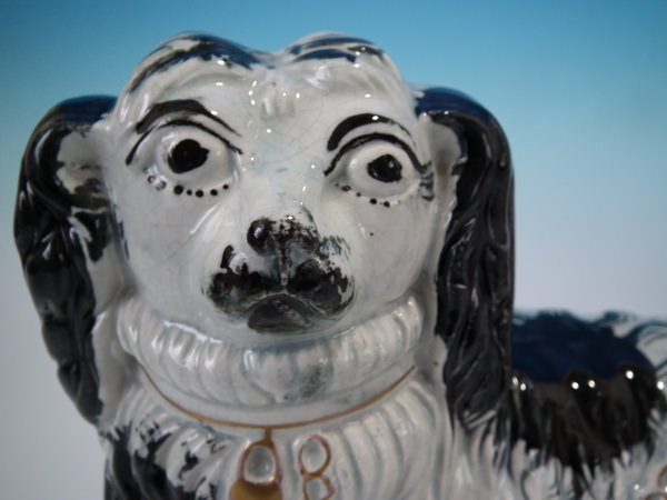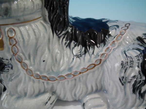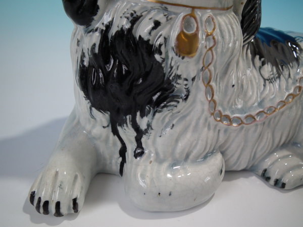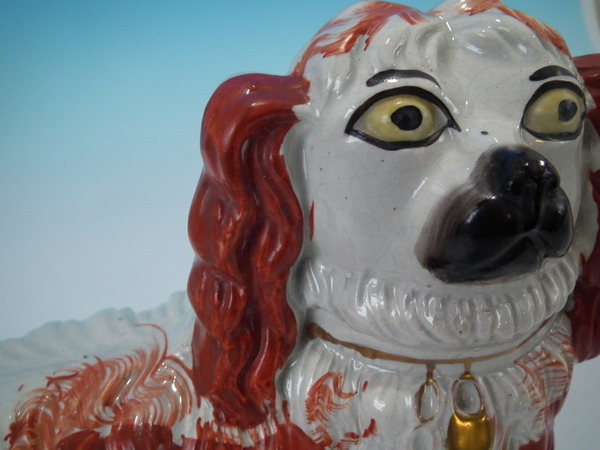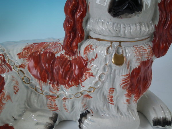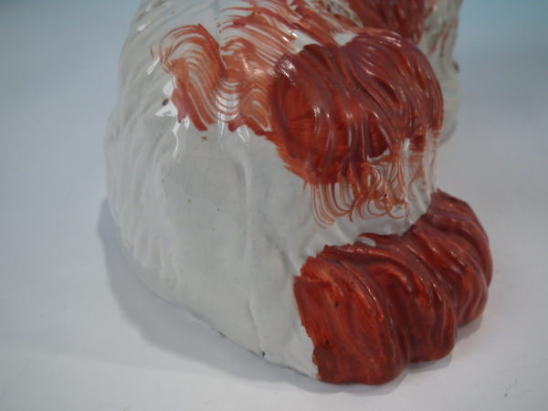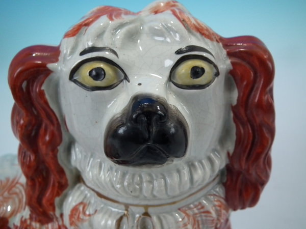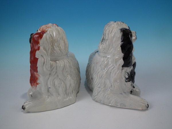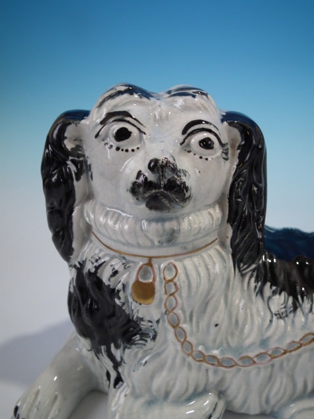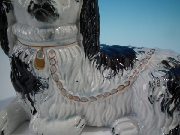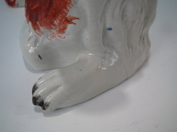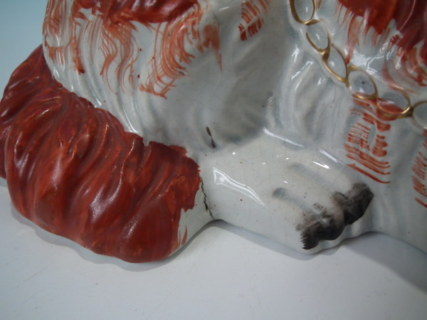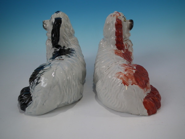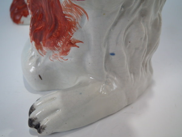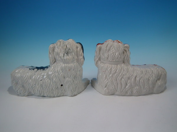 Victorian, circa 1860. Tallest is 6.5ins high, 10ins wide, 5.1ins depth. Pair of Staffordshire figures which feature a spaniel, recumbent directly on the ground, no base.