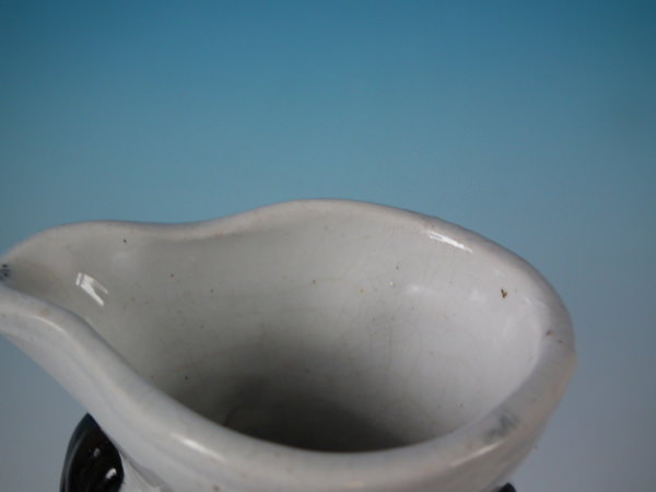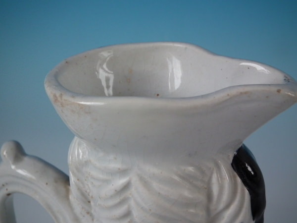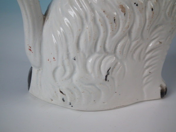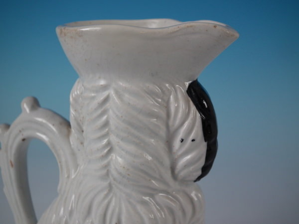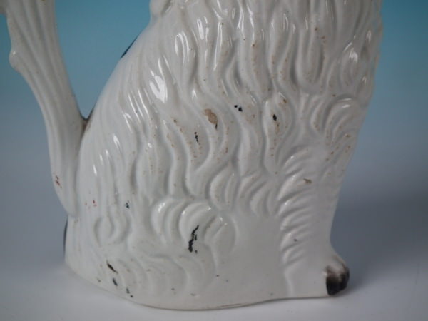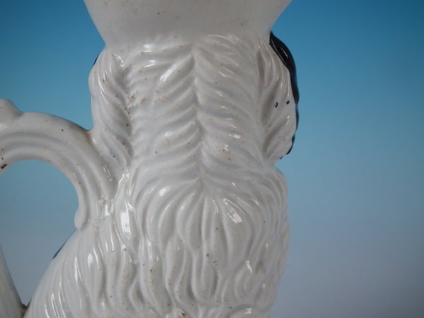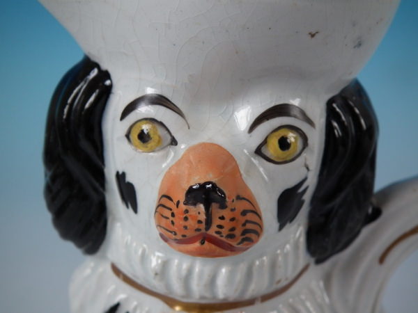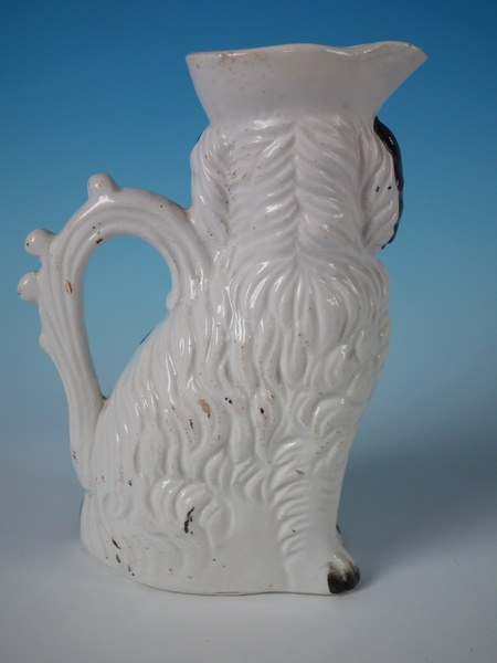 Victorian, circa 1860. 7.8ins high, 5.9ins wide, 3ins depth. Staffordshire jug/pitcher which features a spaniel with a bow, seated directly on the ground, no base.