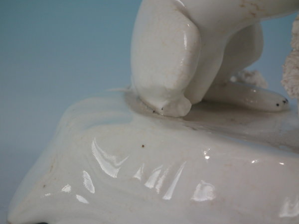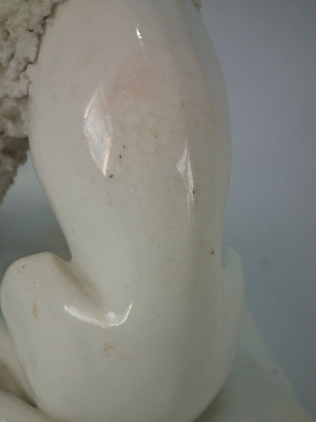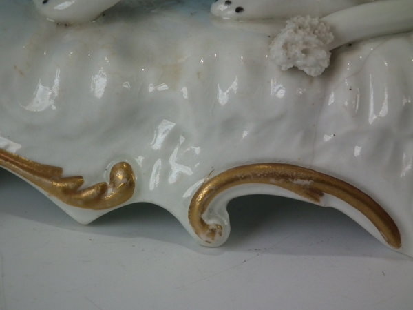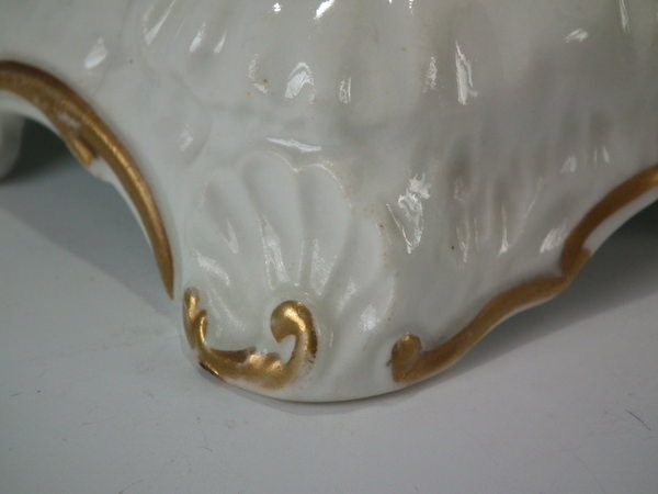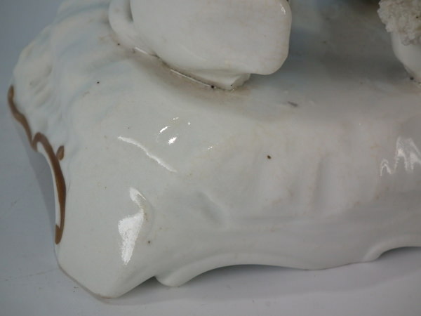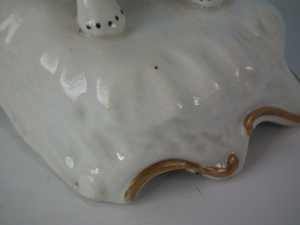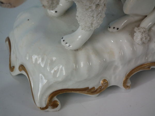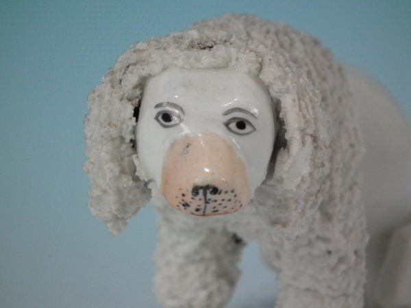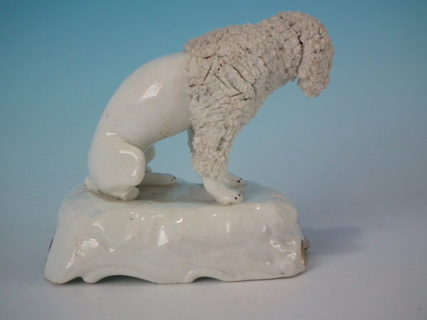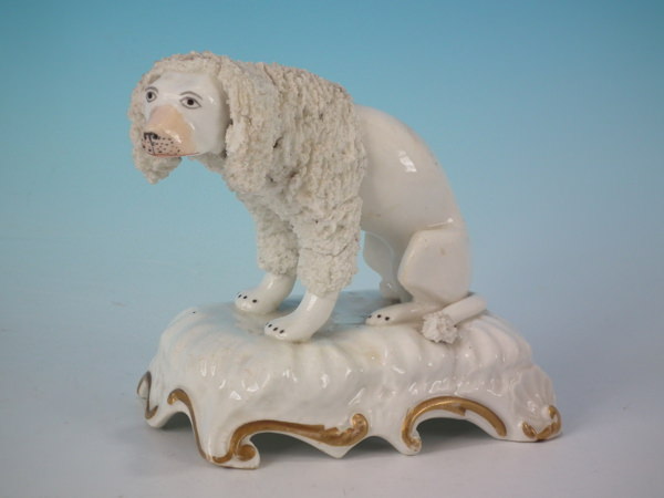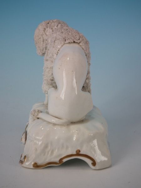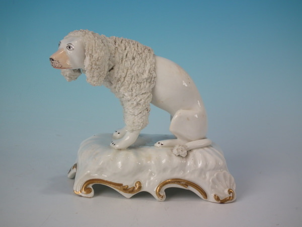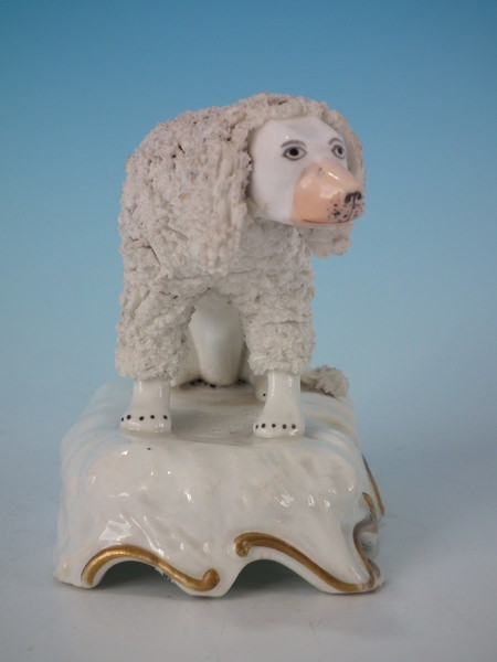Staffordshire porcellaneous figure which features a poodle, seated on a rococo base.