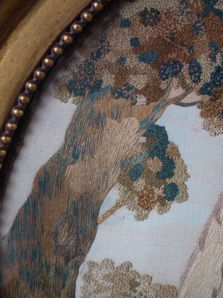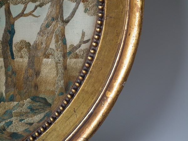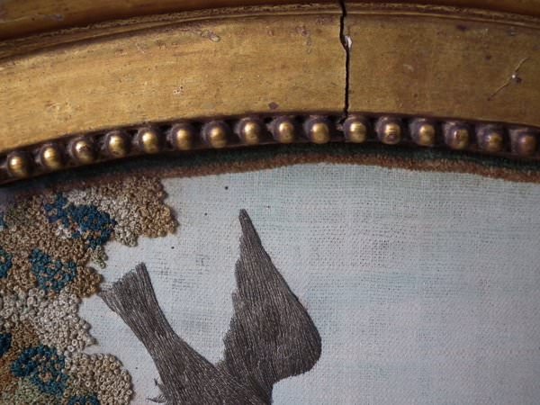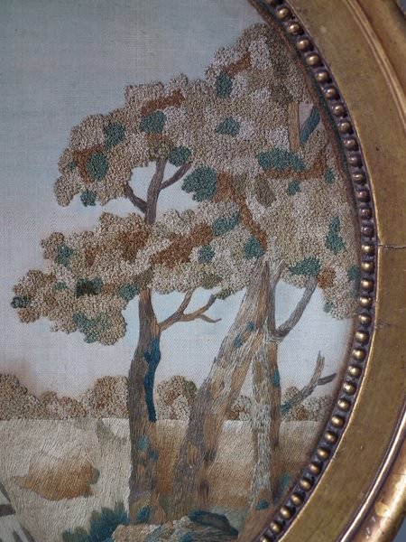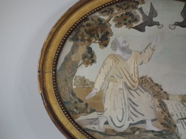 George III, circa 1800. 14ins by 17.5ins wide. Georgian Silkwork Embroidery Picture of Elijah and the Ravens, with painted details. Framed in an old, probably original, gilded, gesso frame with rippled, old glass.