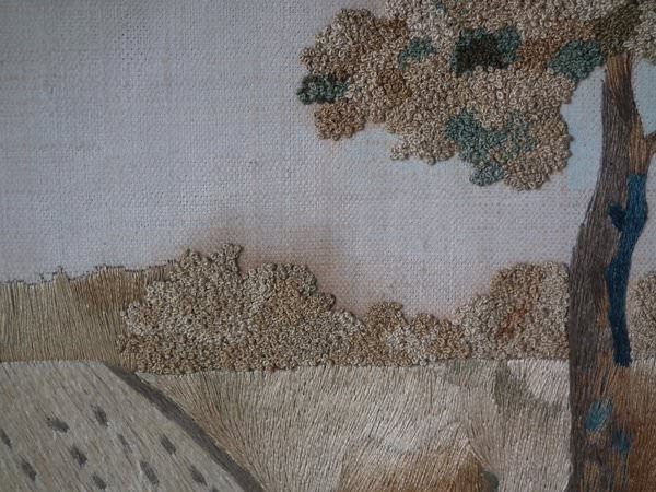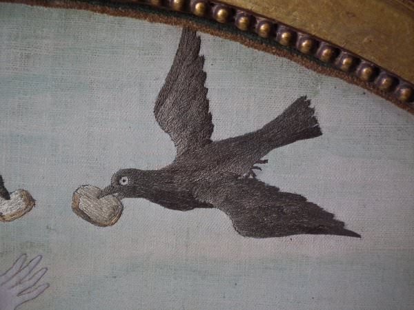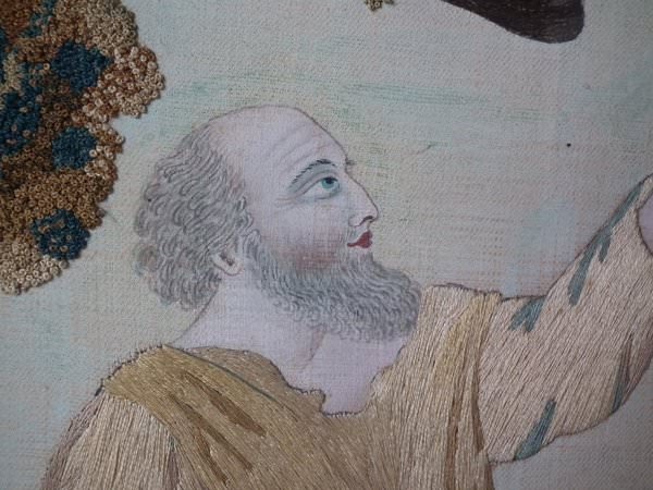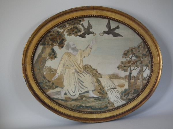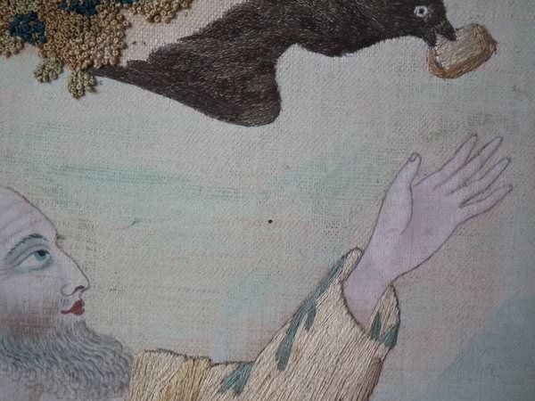 The embroidery is worked in silk on a canvas ground, in a variety of stitches. Handpainted details include the sky and Elijah's face, hands and feet. Colours greys, light brown, dark brown, gold, greens and cream. Religious subject to the picture of Elijah and the Ravens.